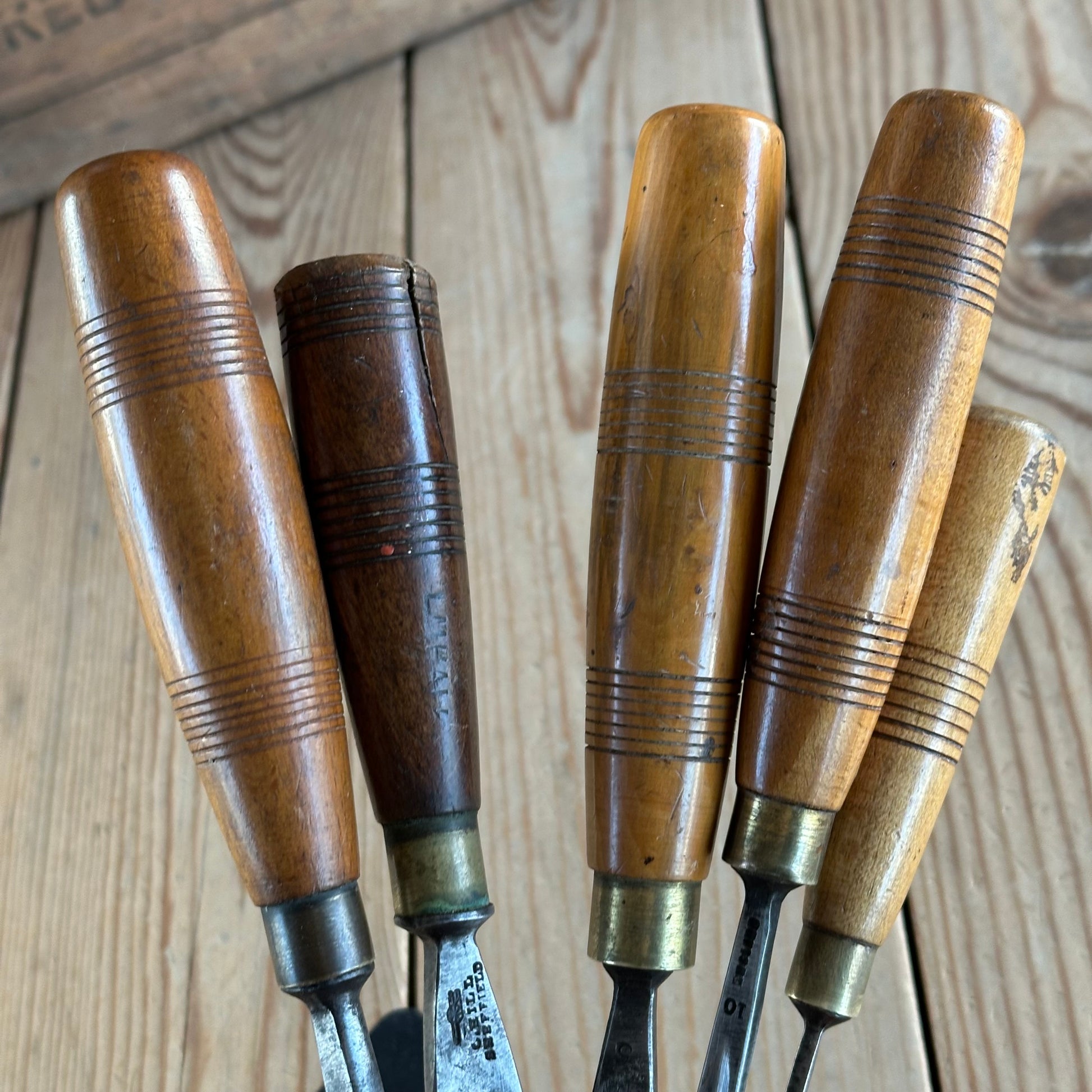 These chisels are in authentic vintage condition, wear & tear consistent with age & use. The 19mm has a spilt handle in the end. They will require a sharpen prior to use, a lovely set by good makers.