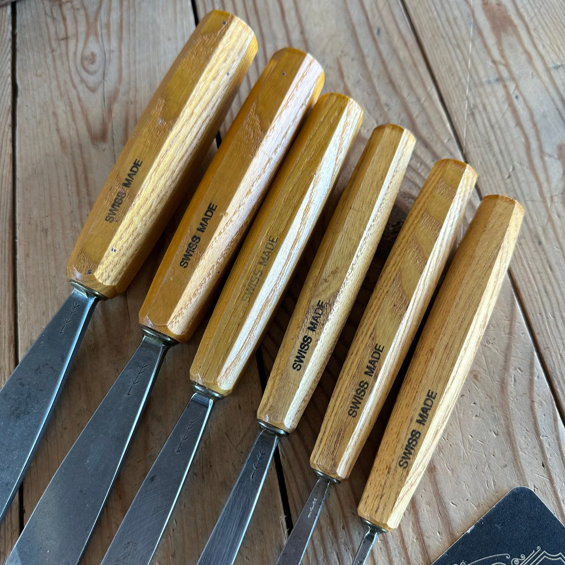 Up for sale is a handy set of 6 x No:1 SKEW chisels by SWISS Toolmaker PFEIL.