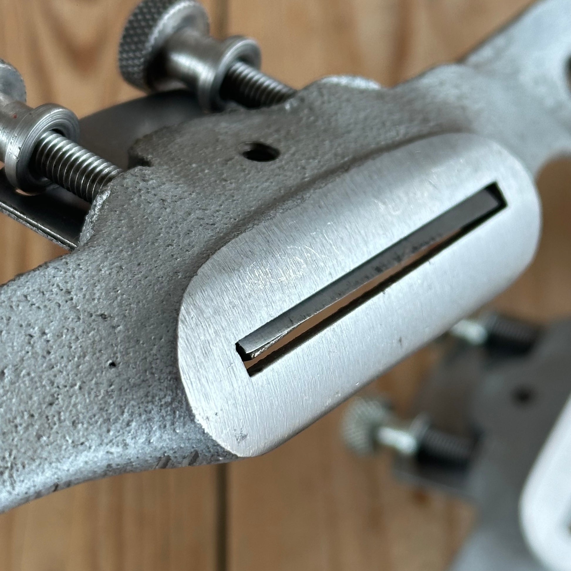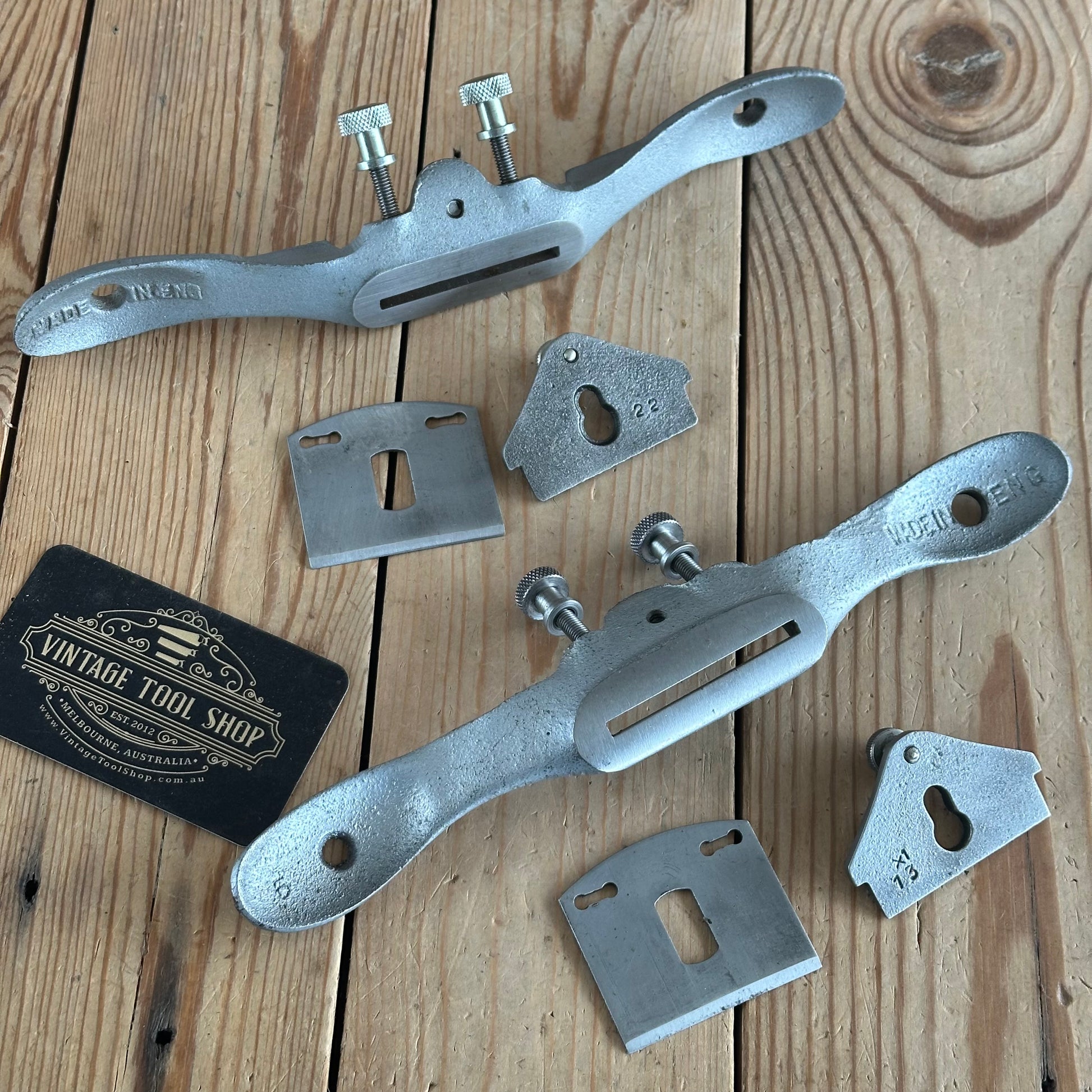 These spokeshaves are in authentic vintage condition, wear & tear consistent with age & use, they will require a sharpen. Tidy examples with a near full blades & one sports trade labels.