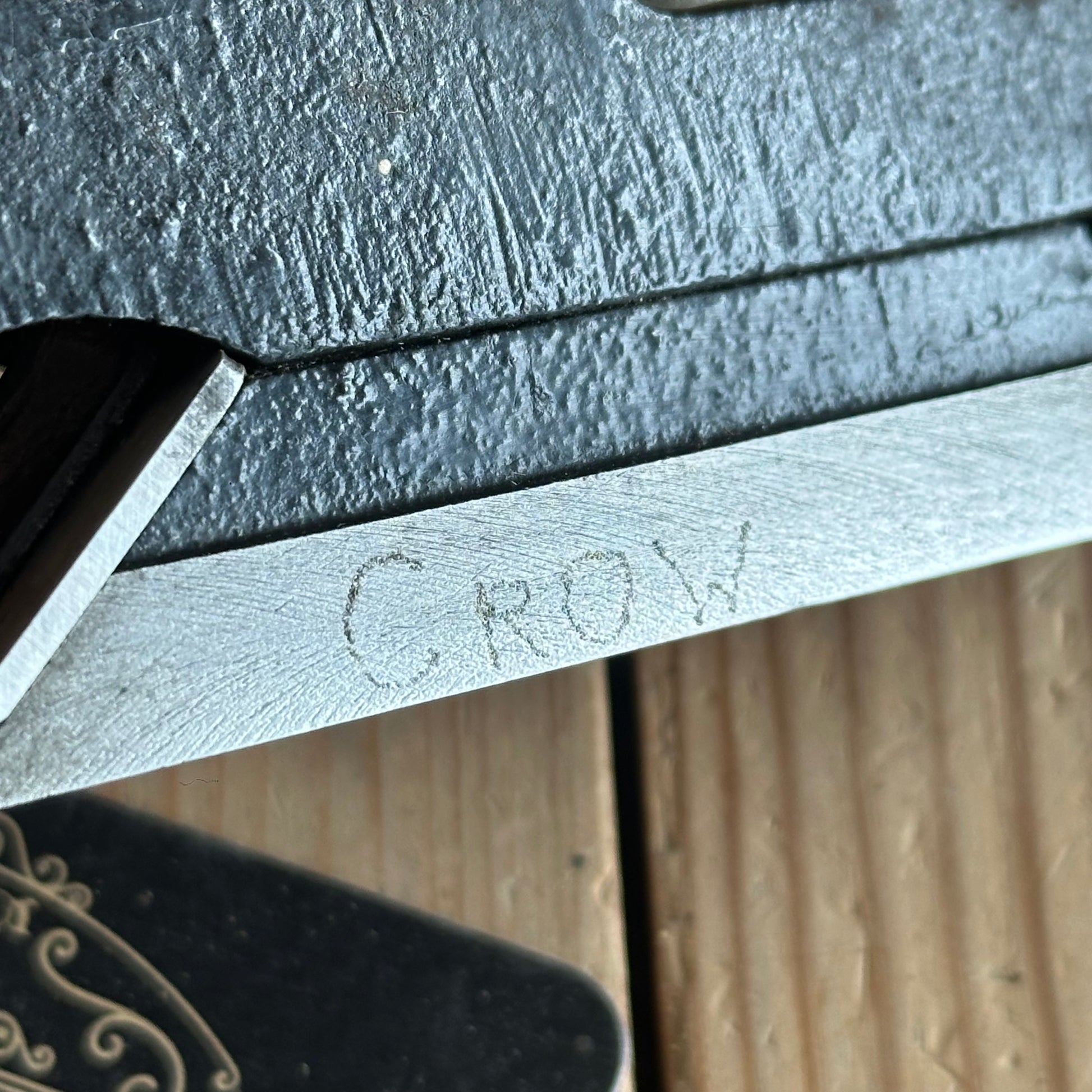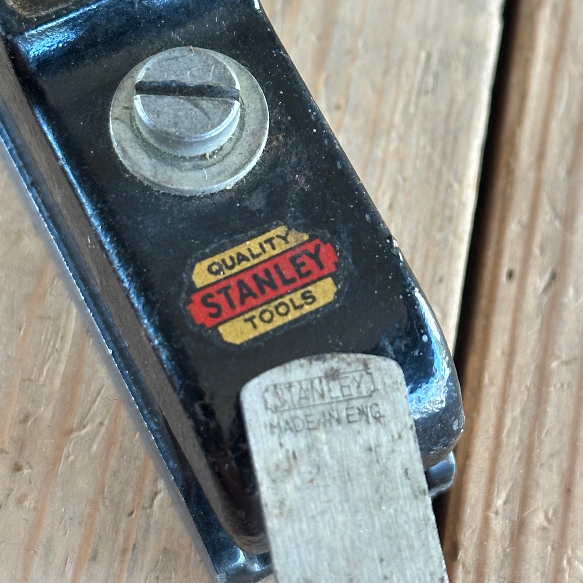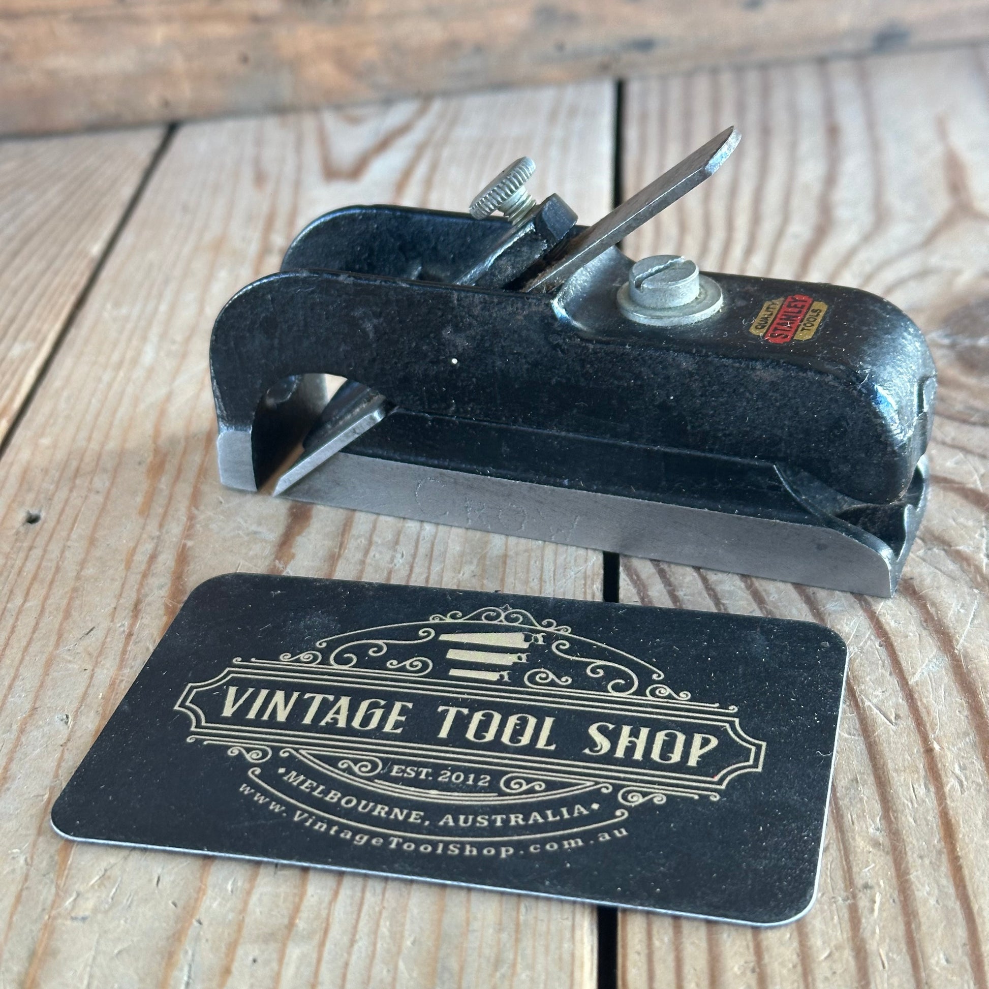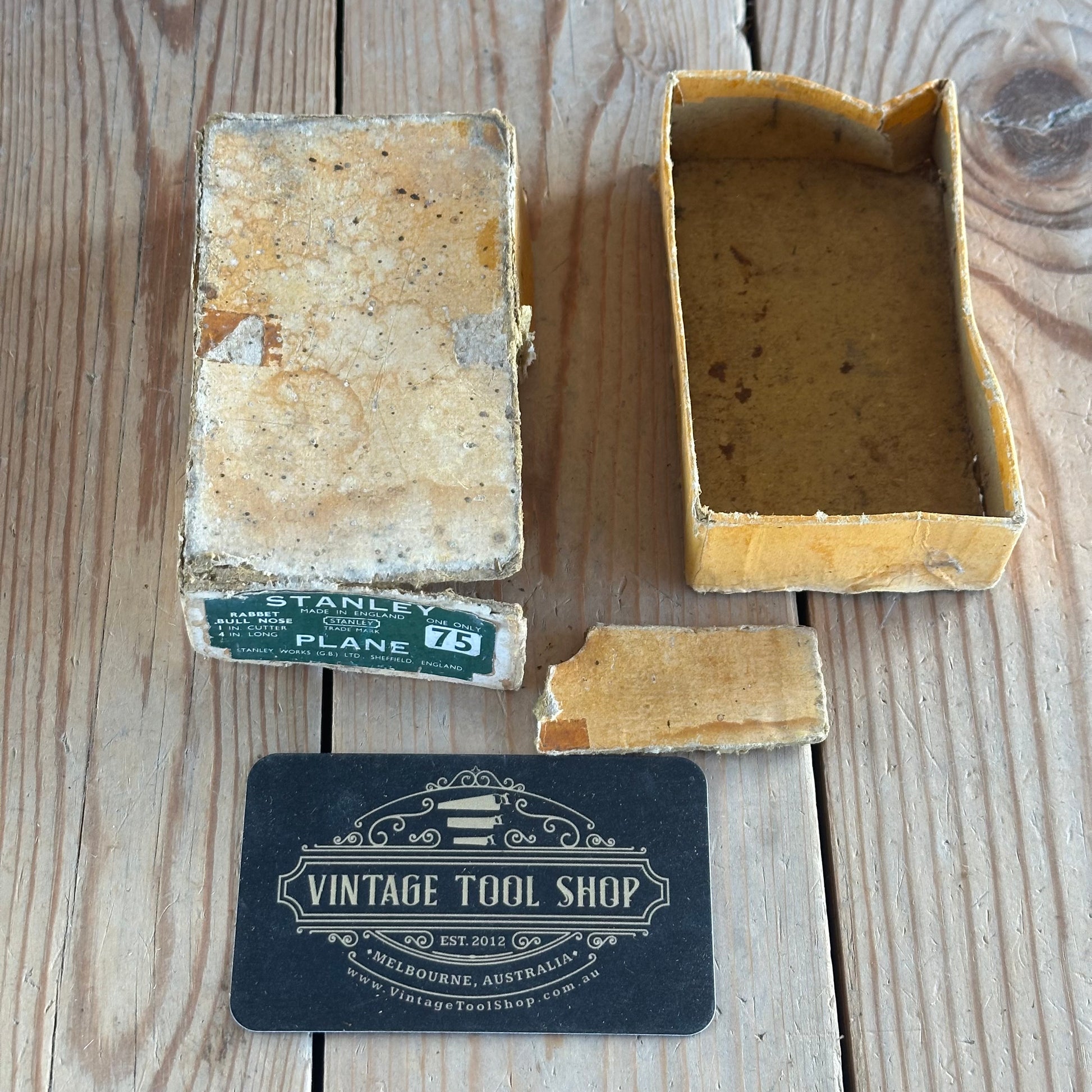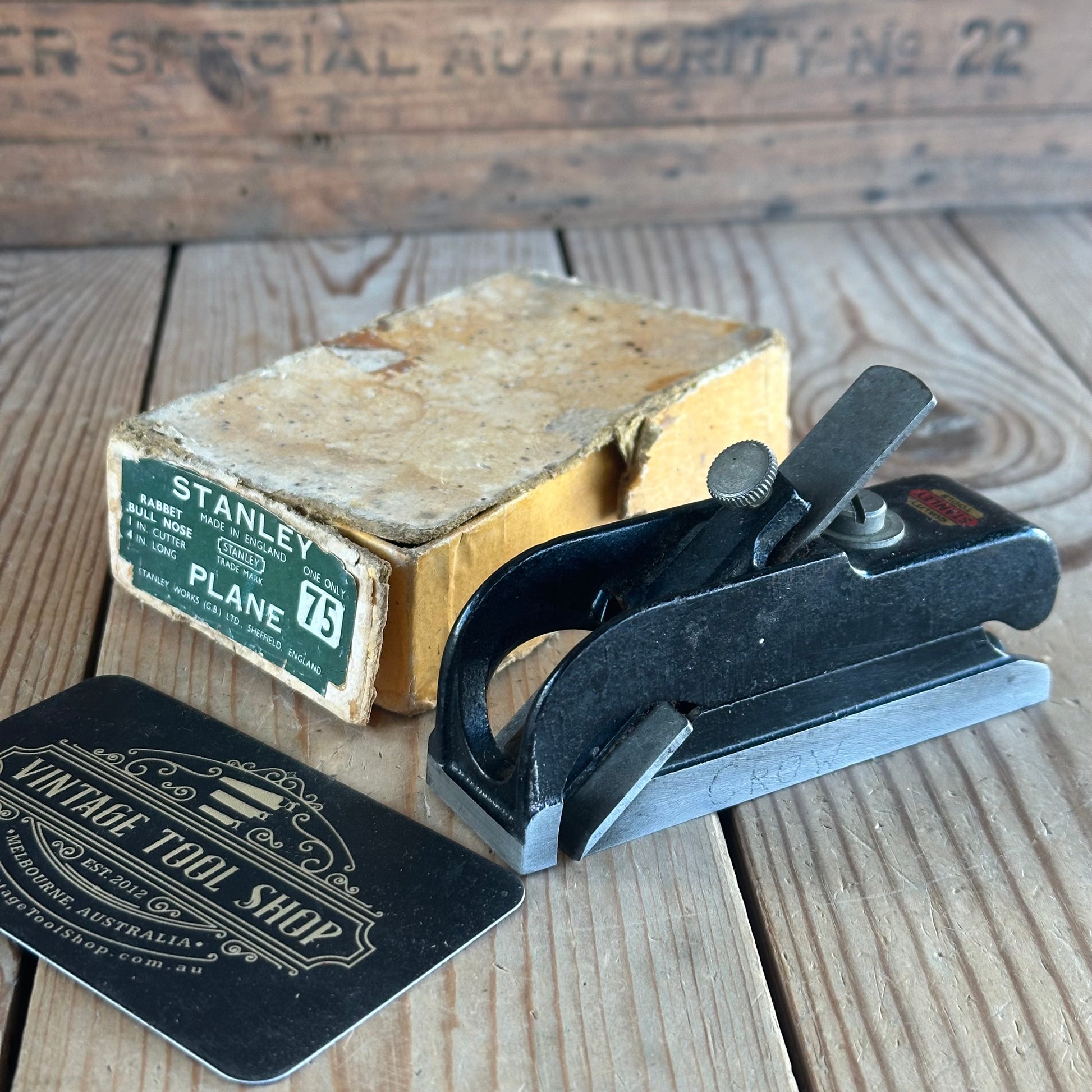 This plane is in authentic vintage condition, wear and tear consistent with age & use, a previous owner’s name engraved on one side & some rust pits, the box is tatty and worn; the plane is tidy, a near full Stanley decal. A good example of a 75 bullnose rabbet.