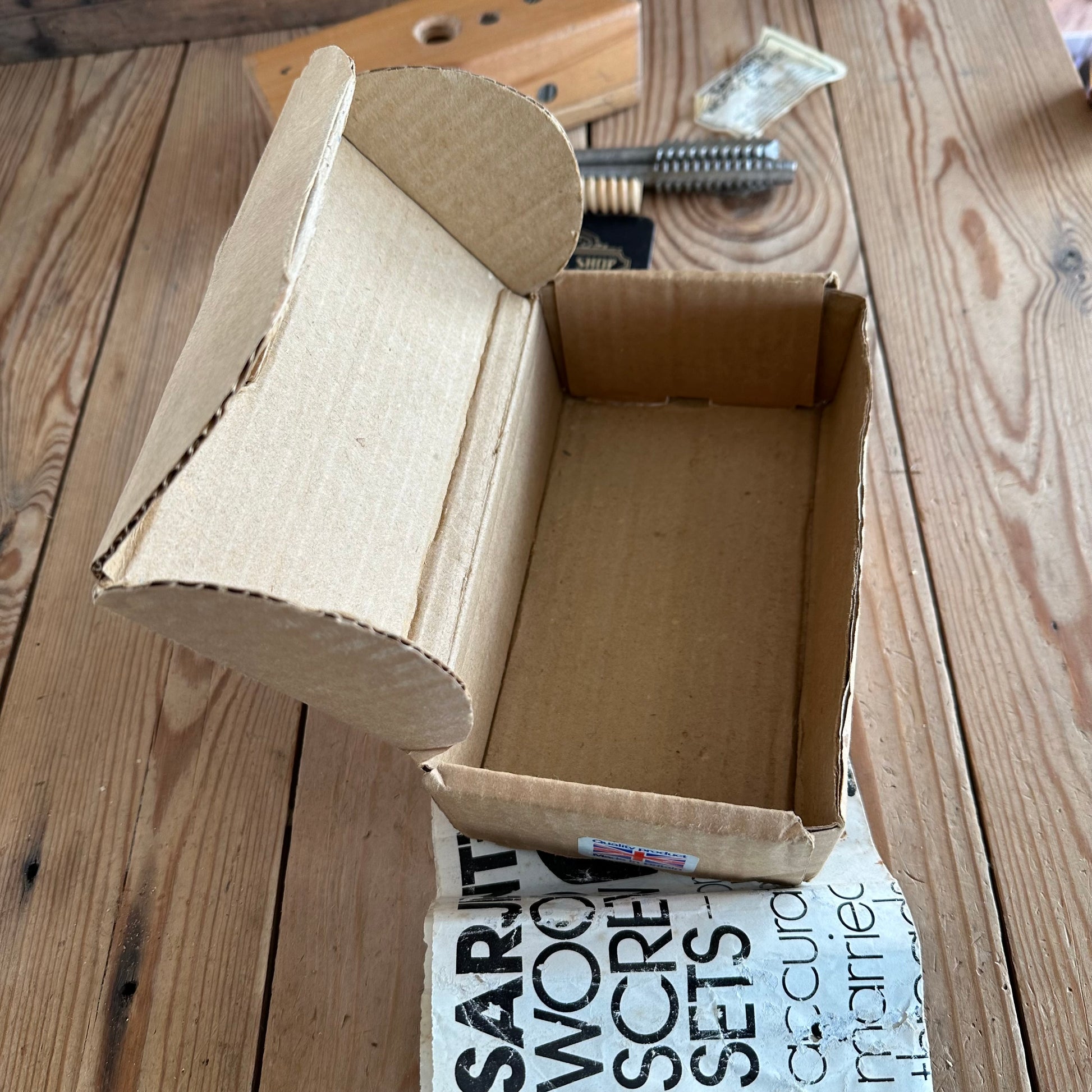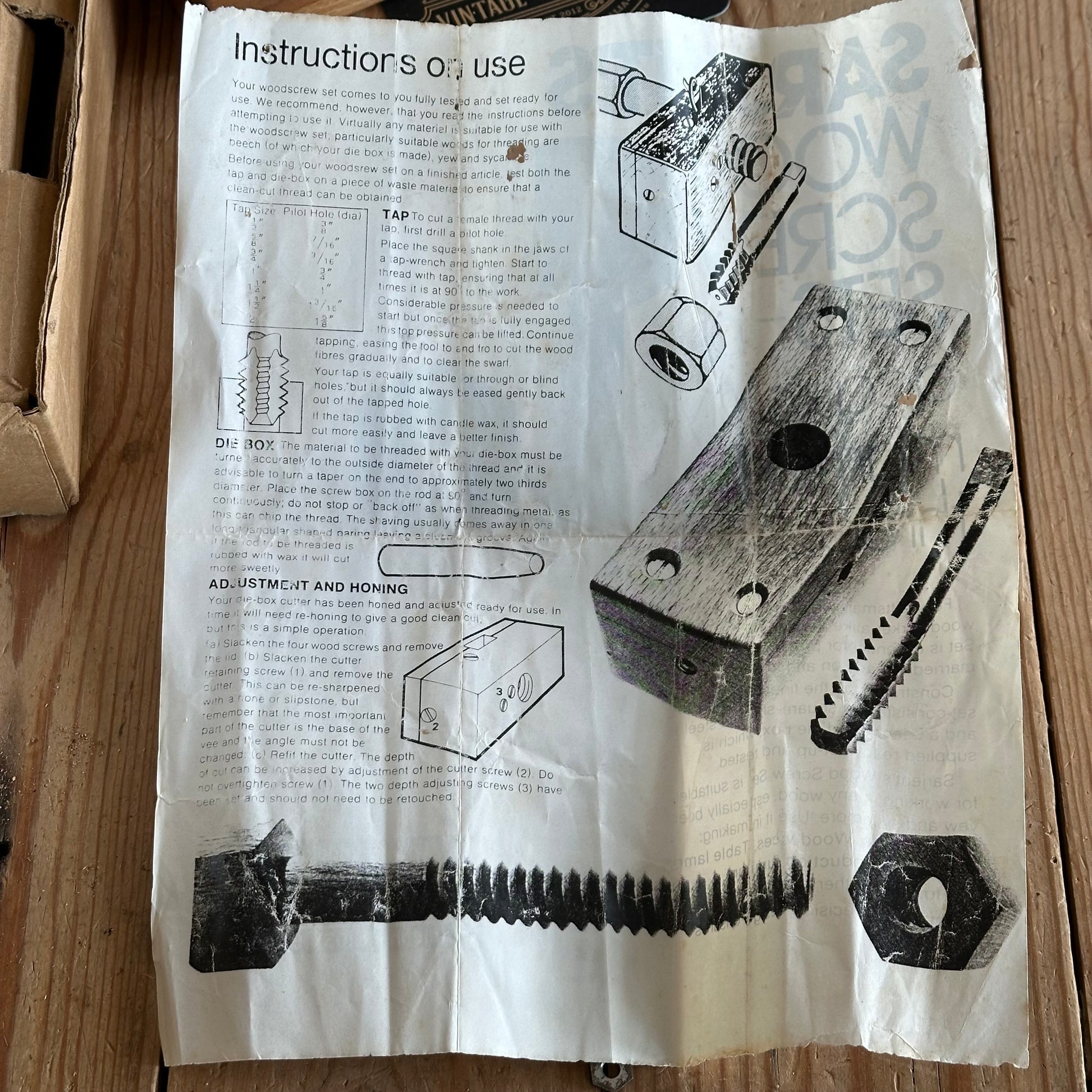 Up for sale is a handy vintage screw box, for cutting thread onto wooden dowels. It cuts a 5/8” or 14mm diameter thread from a 15mm dowel. Comes with 2 x wood taps in its original box. Made in England.