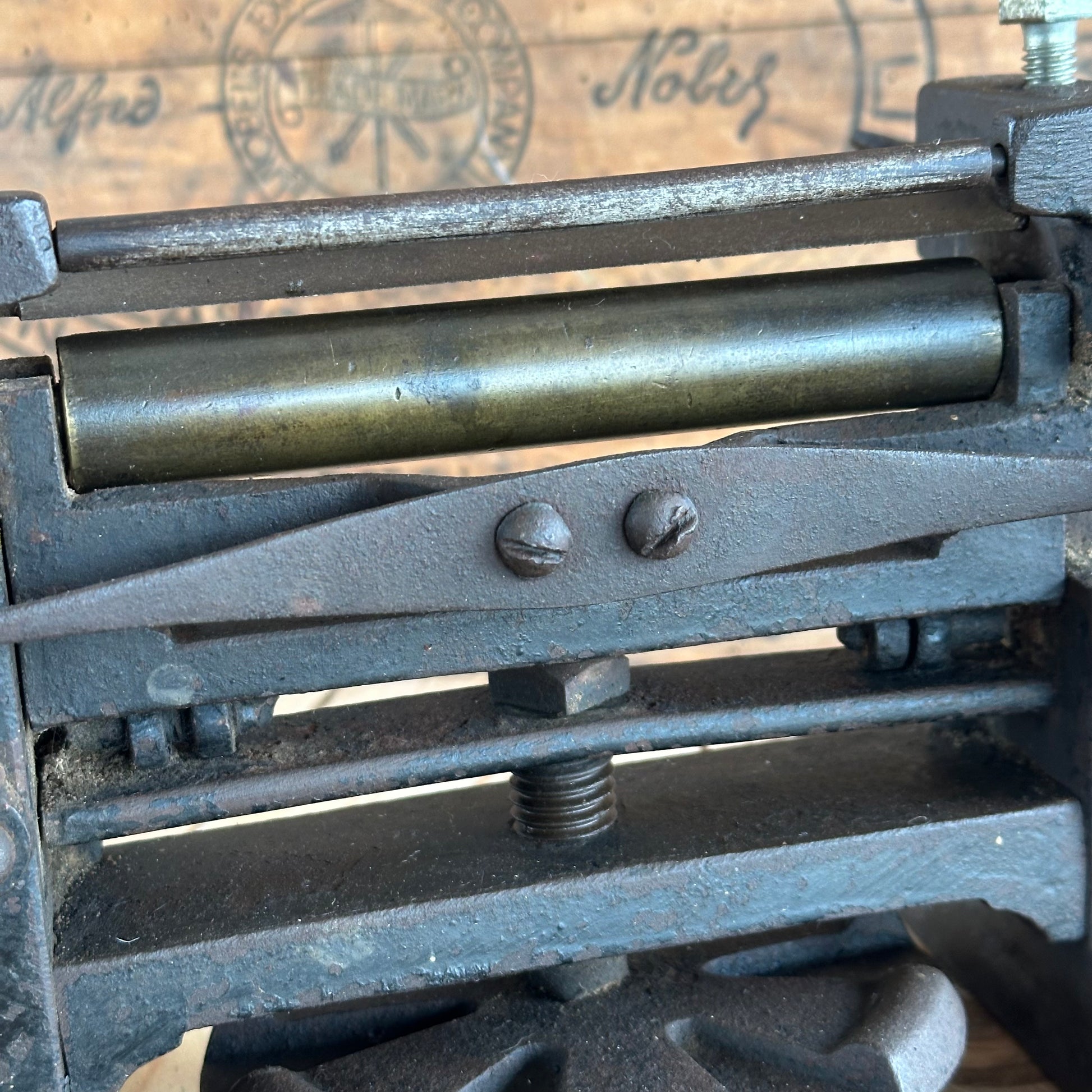 This skiving machine is in authentic vintage condition, wear & tear consistent with age & use. The top blade locking bolts have been replaced at some point in its life, just needs a sharpen, handy for the workshop.