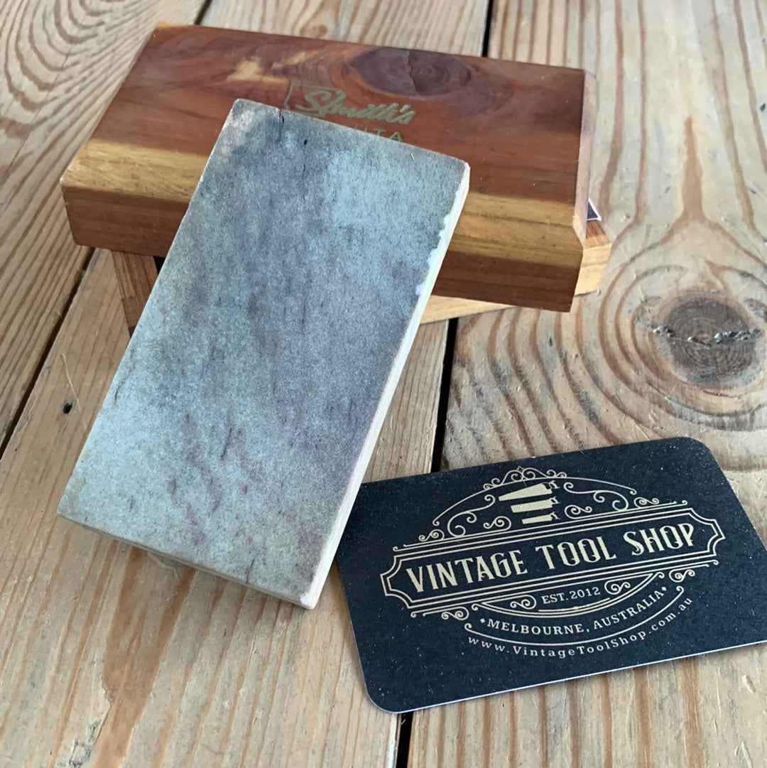 This stone is in authentic vintage condition, wear and tear consistent with age, in its original Smiths wooden box base, minor chipping to one edge, it looks to be hardly used.
