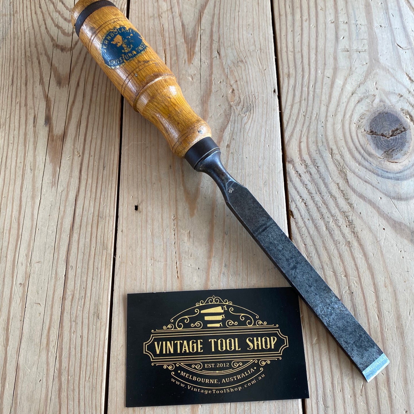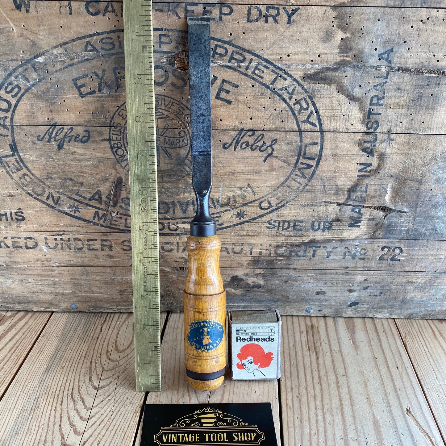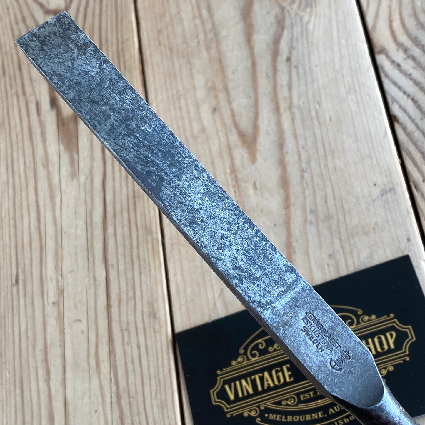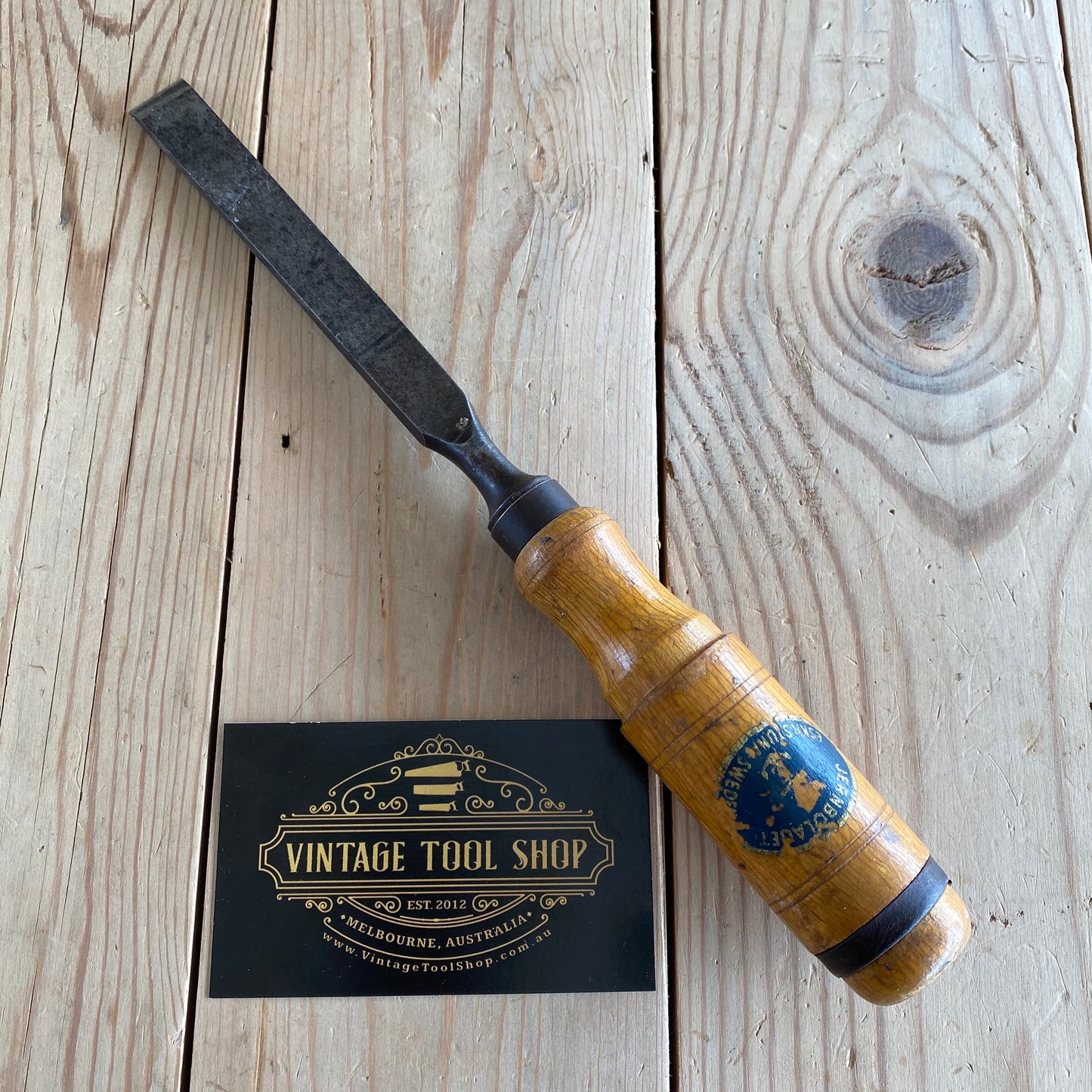 This chisel is in authentic vintage condition, wear & tear consistent with age & use, most of the original decal remains on the handle, it's in good shape a near full blade & the handle hasn't been struck, it will require sharpening prior to use, a hard to find Jernbolaget firmer chisel.