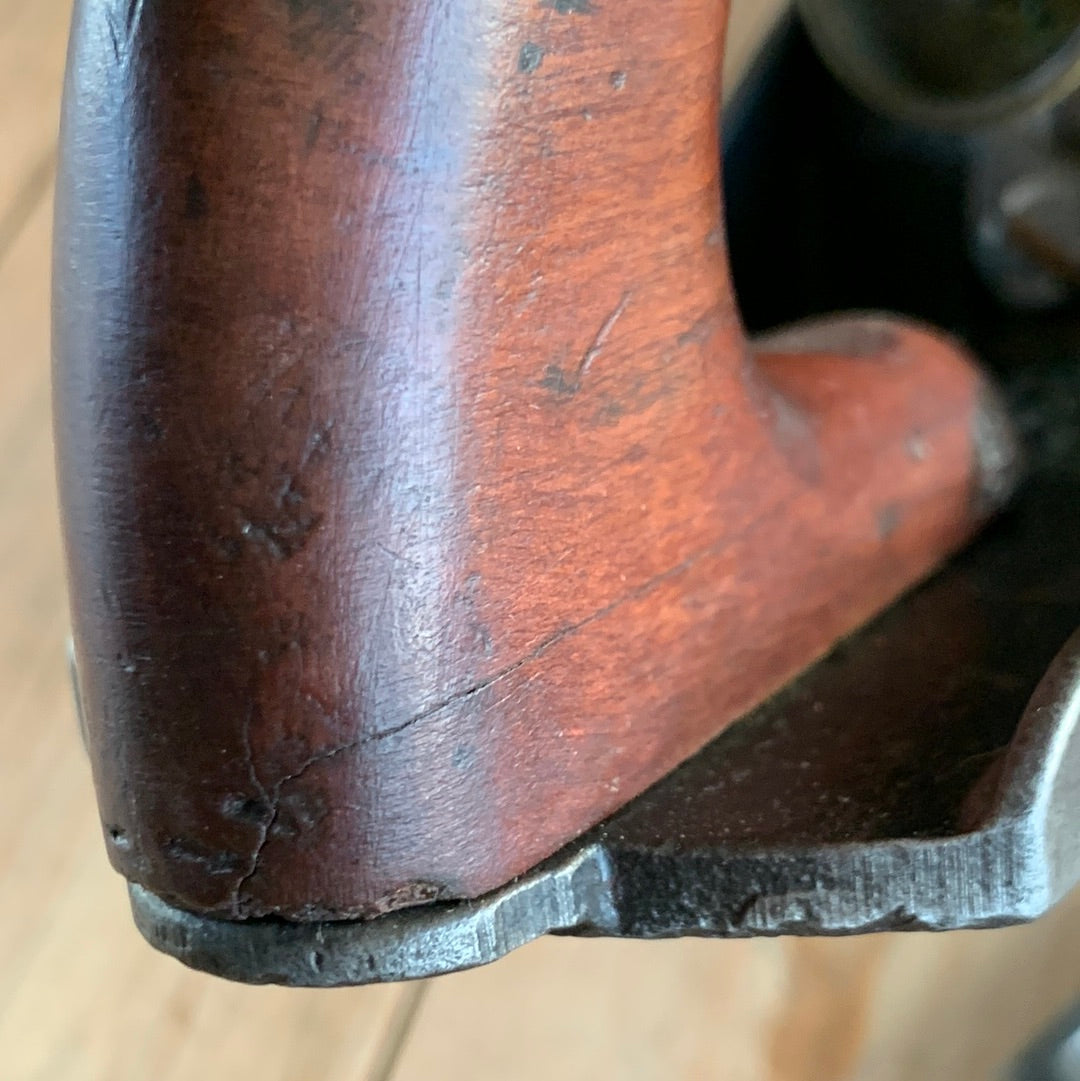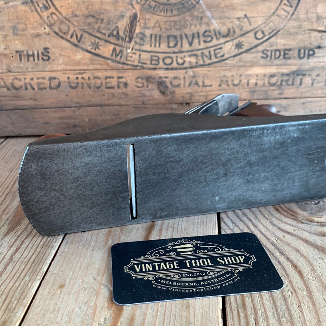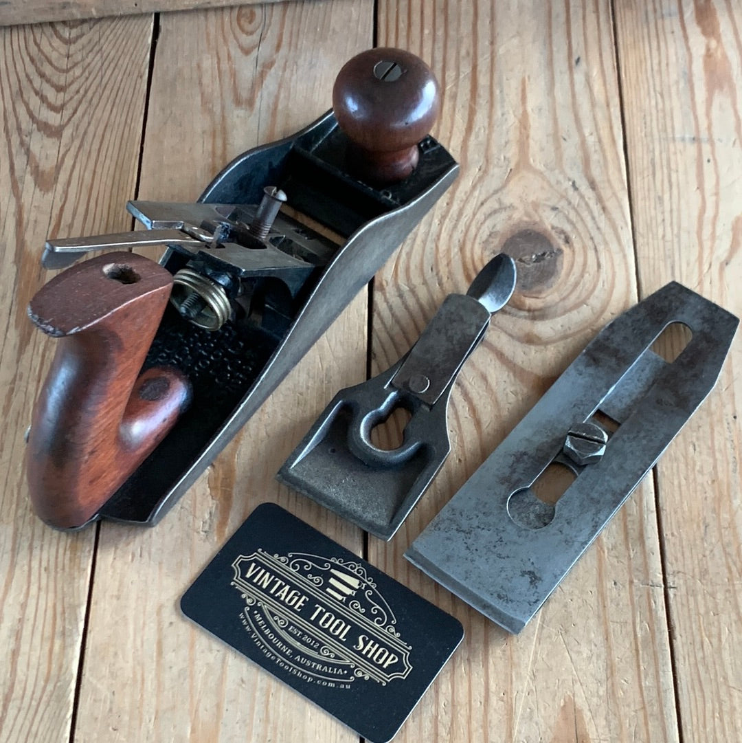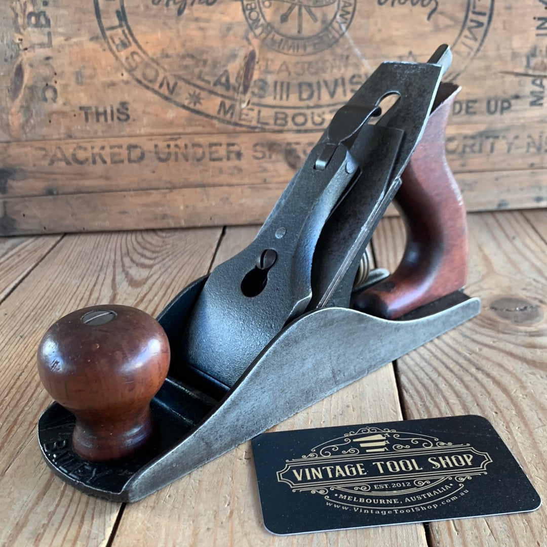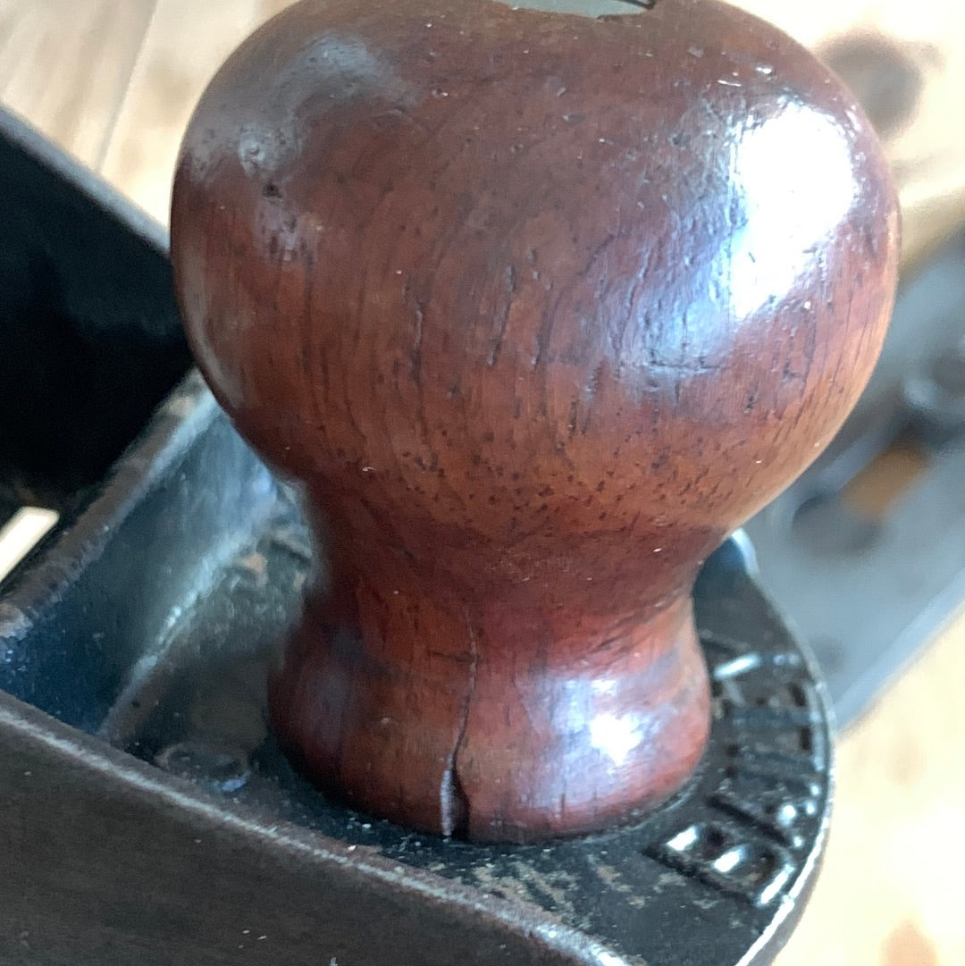 This plane is in authentic vintage condition, wear and tear consistent with age & use, tidy, an age check & a tiny chip to the base of the front knob & a repair & filled hole to the rear handle, will require sharpening prior to use.