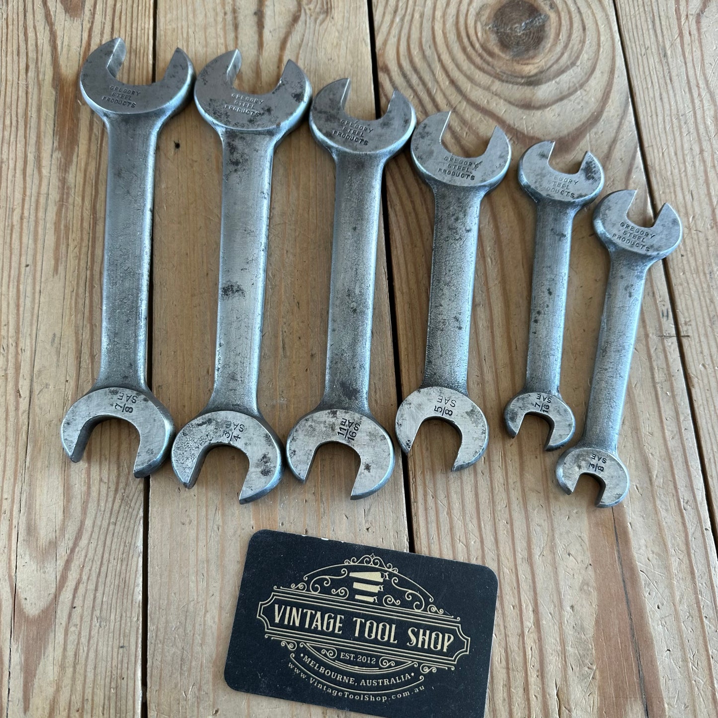 Up for sale is a cool vintage set of 6 x GREGORY STEEL PRODUCTS (GREGSTEEL) double ended spanners in SAE / imperial sizes.