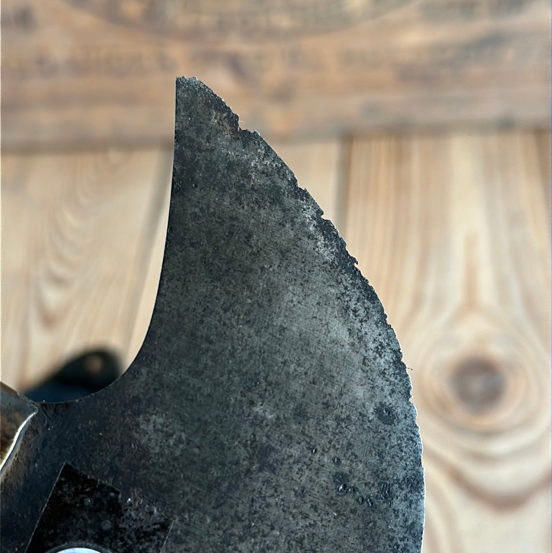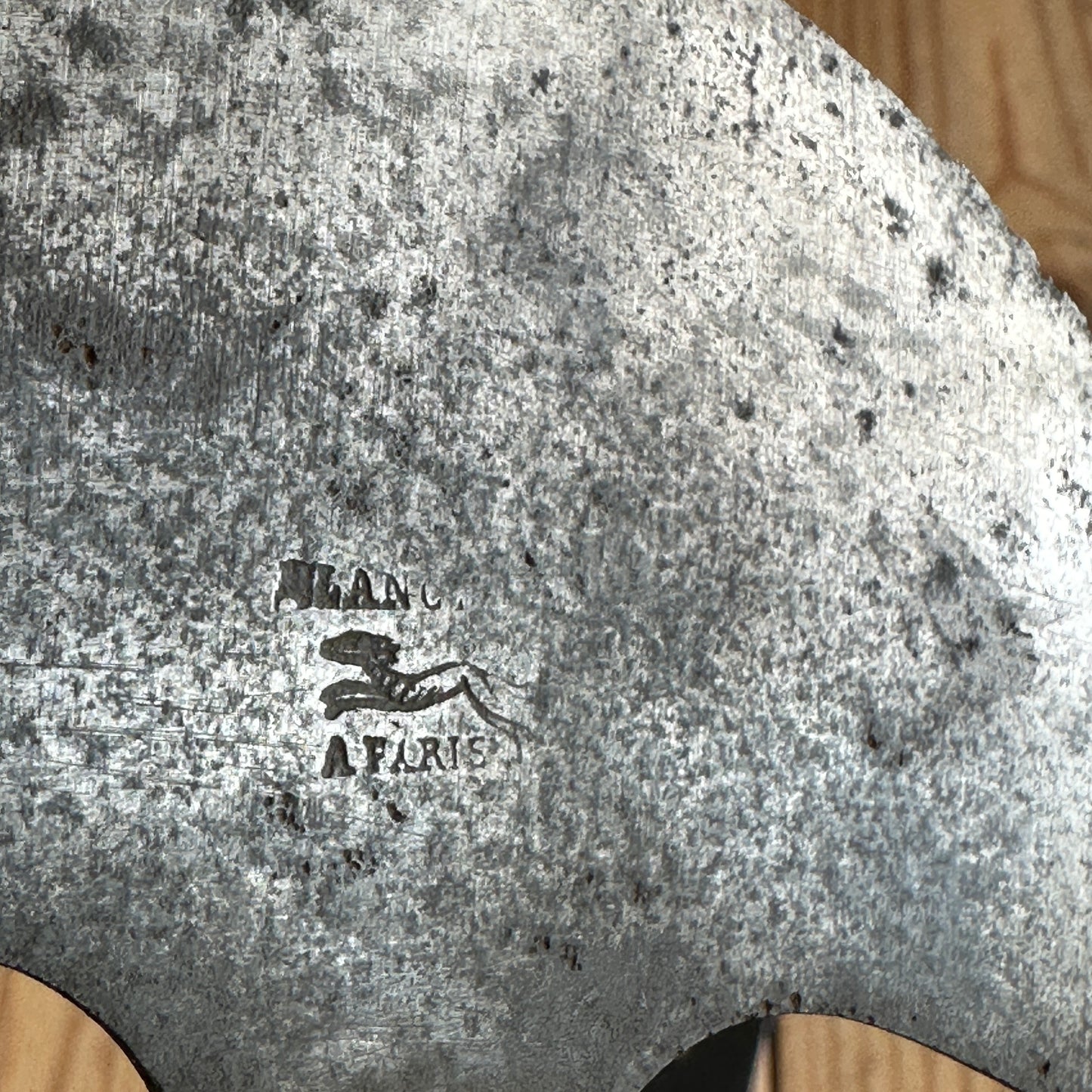 This knife is in authentic vintage condition, wear & tear consistent with age & use, some rust nibbles to the cutting edge that will sharpen out. Will require sharpening prior to use. A lovely ebony handle, a nice 1/2 moon knife that will restore well from Blanchard of Paris.