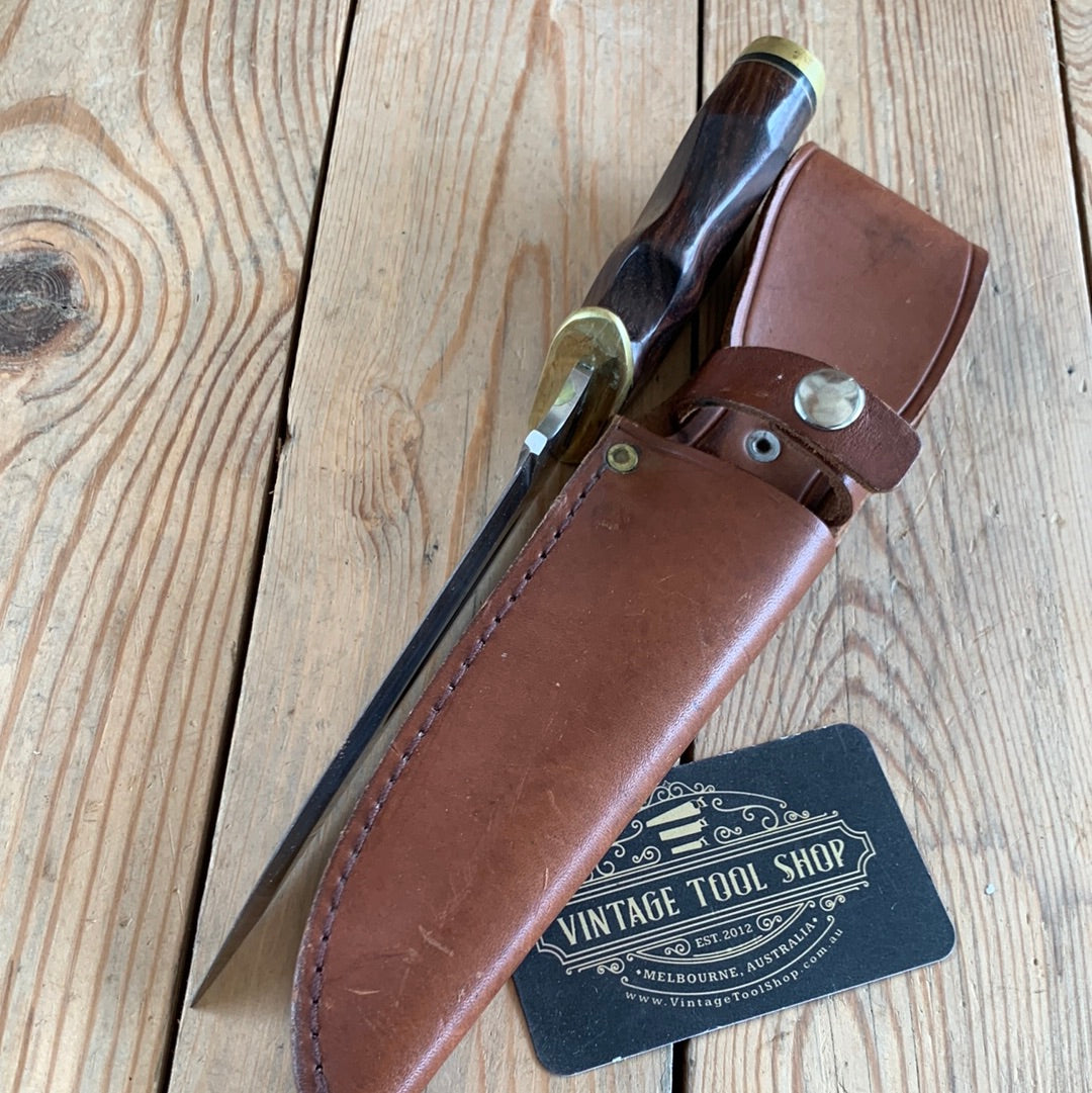 Up for sale is a gorgeous JAPANESE made HUNTING KNIFE, a high quality knife - the blade is HIGH CARBON STAINLESS & the handle is solid INDIAN ROSEWOOD with sculptural finger notches, strong rat tail tang construction.
