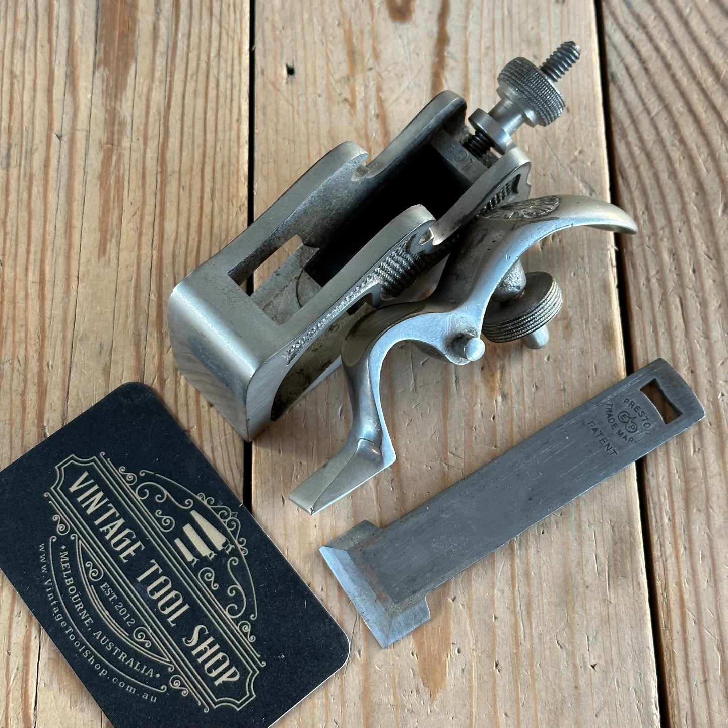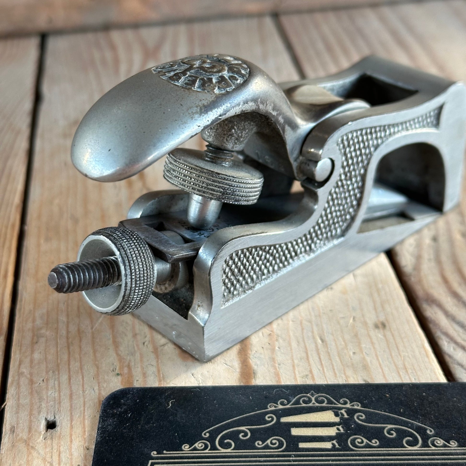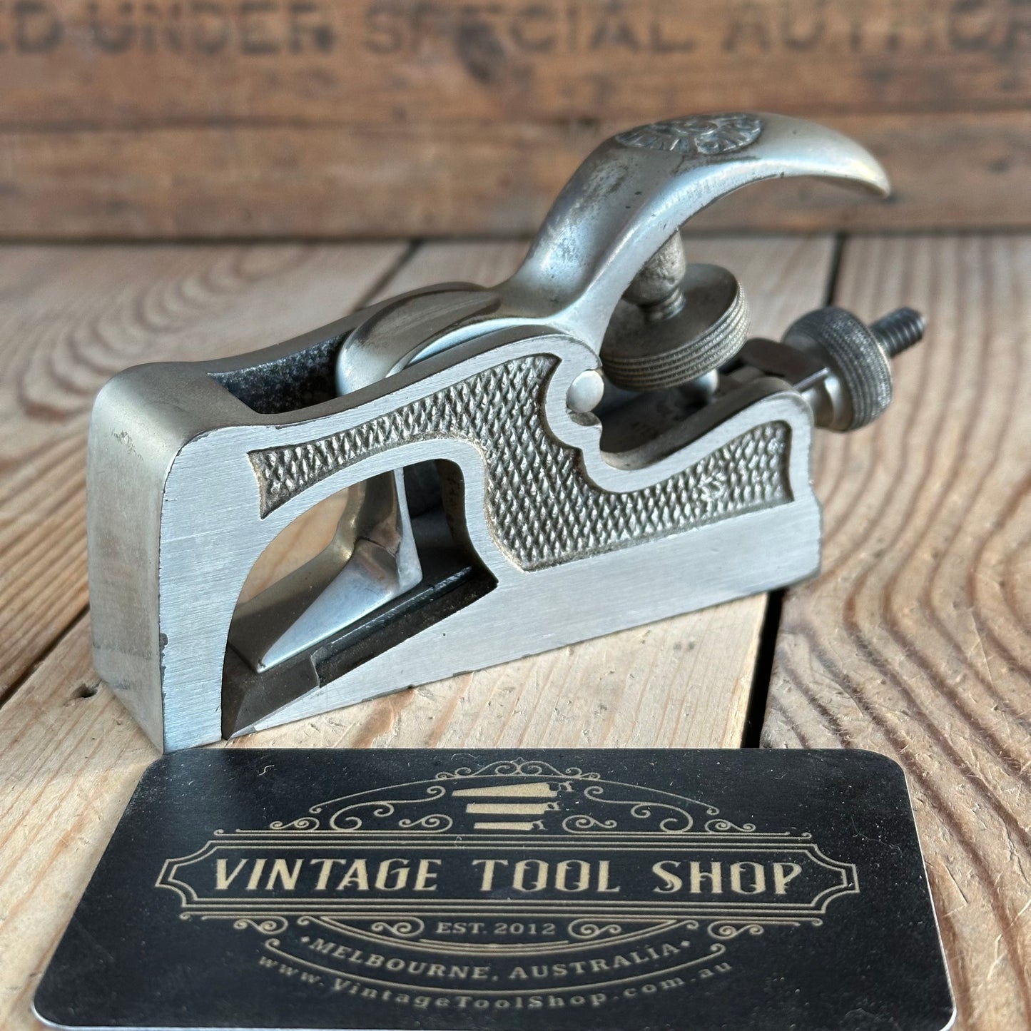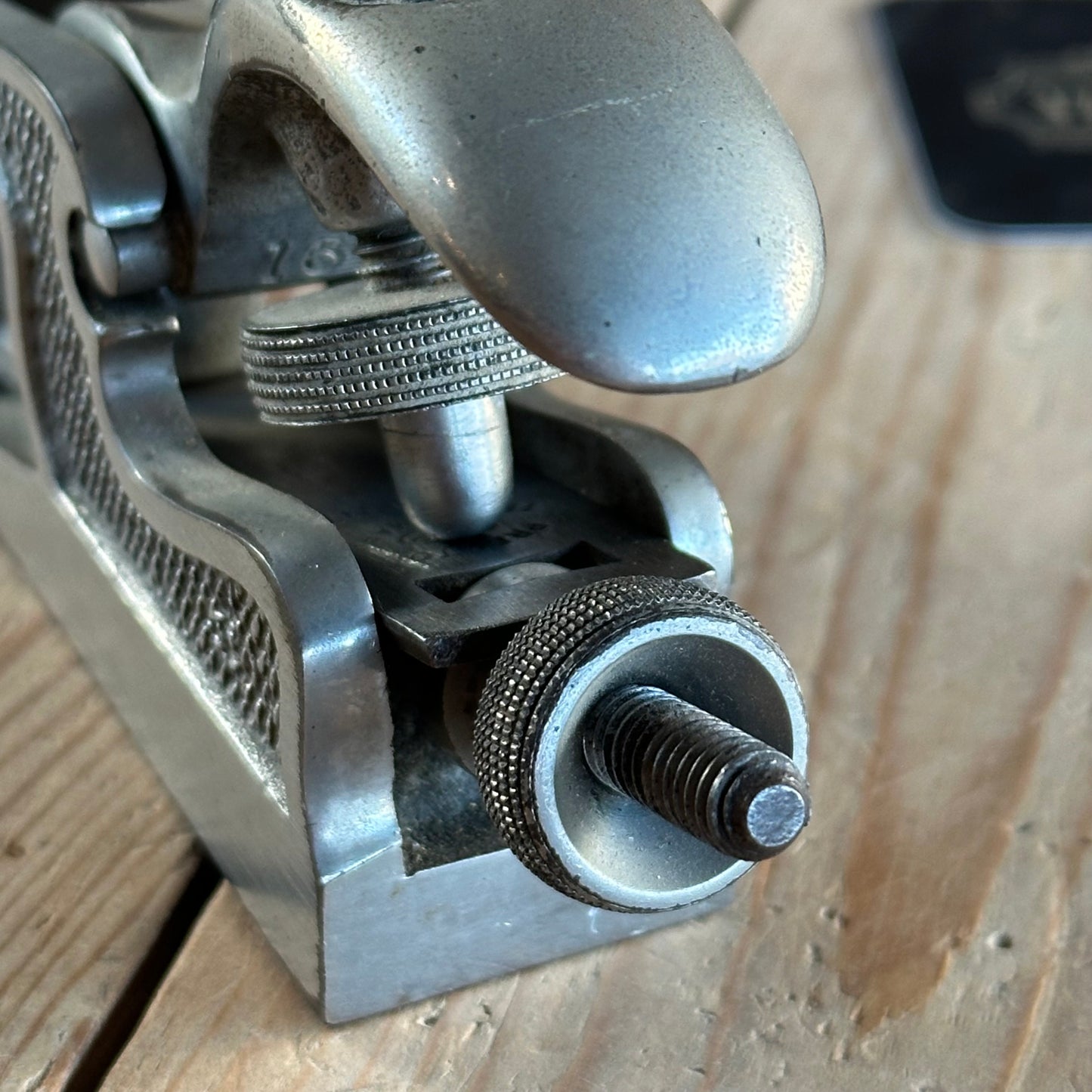 This plane is in authentic vintage condition, wear & tear consistent with age & use, some patches of plating loss, matching number stamped body, blade & cap iron, a handy plane for rebate work, it fits the palm well. A nice tight mouth on this one & its near sharp enough to use.