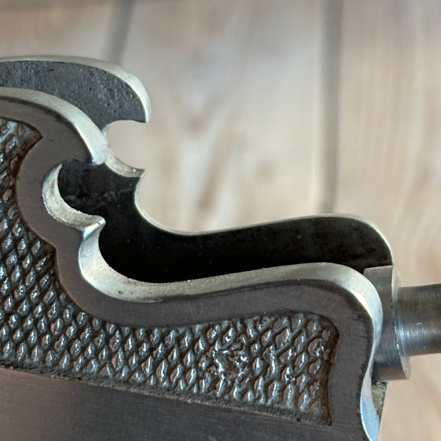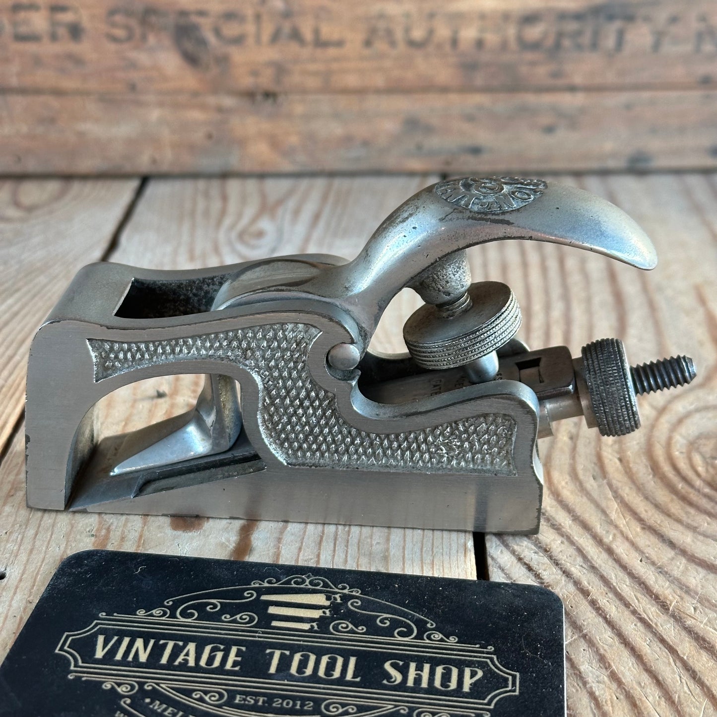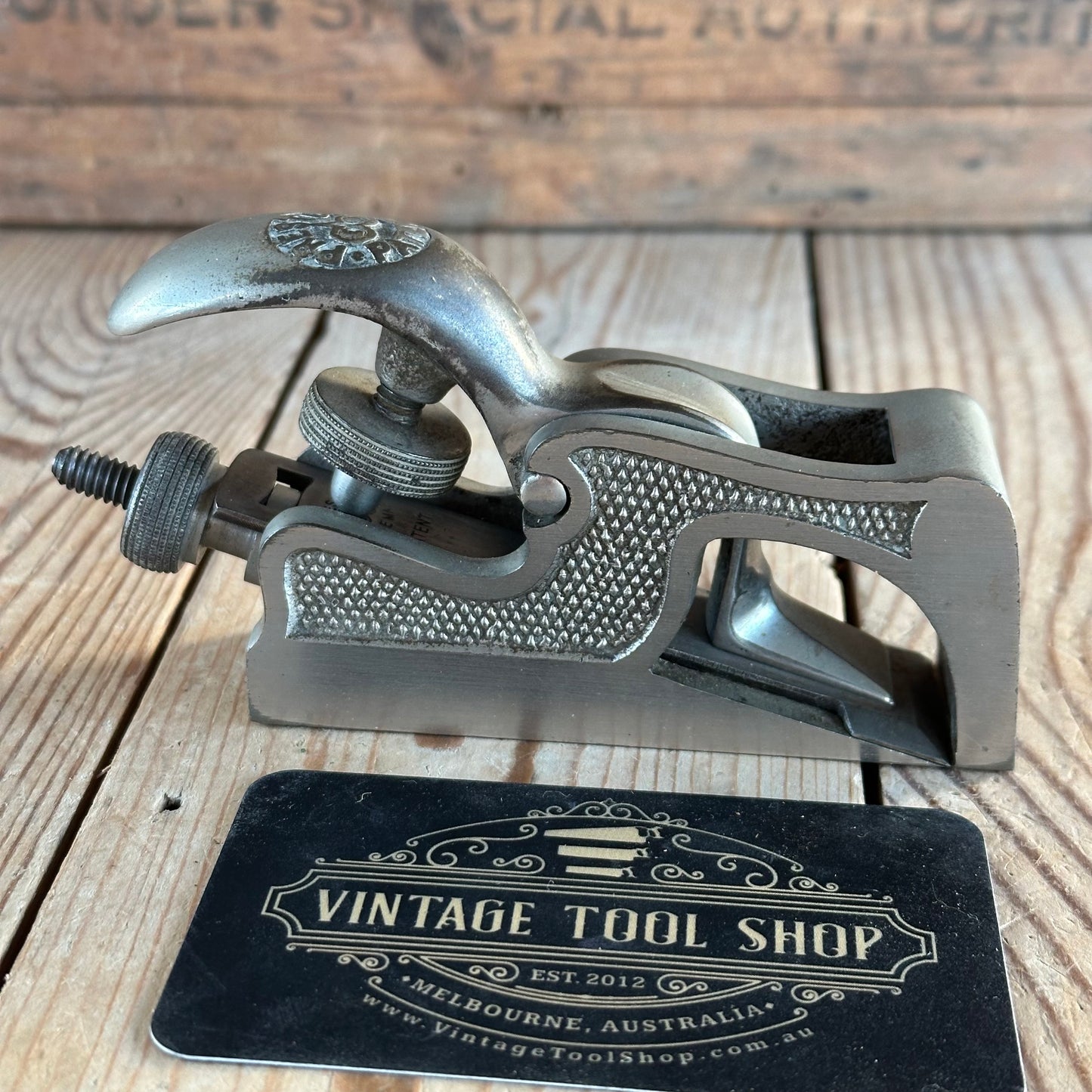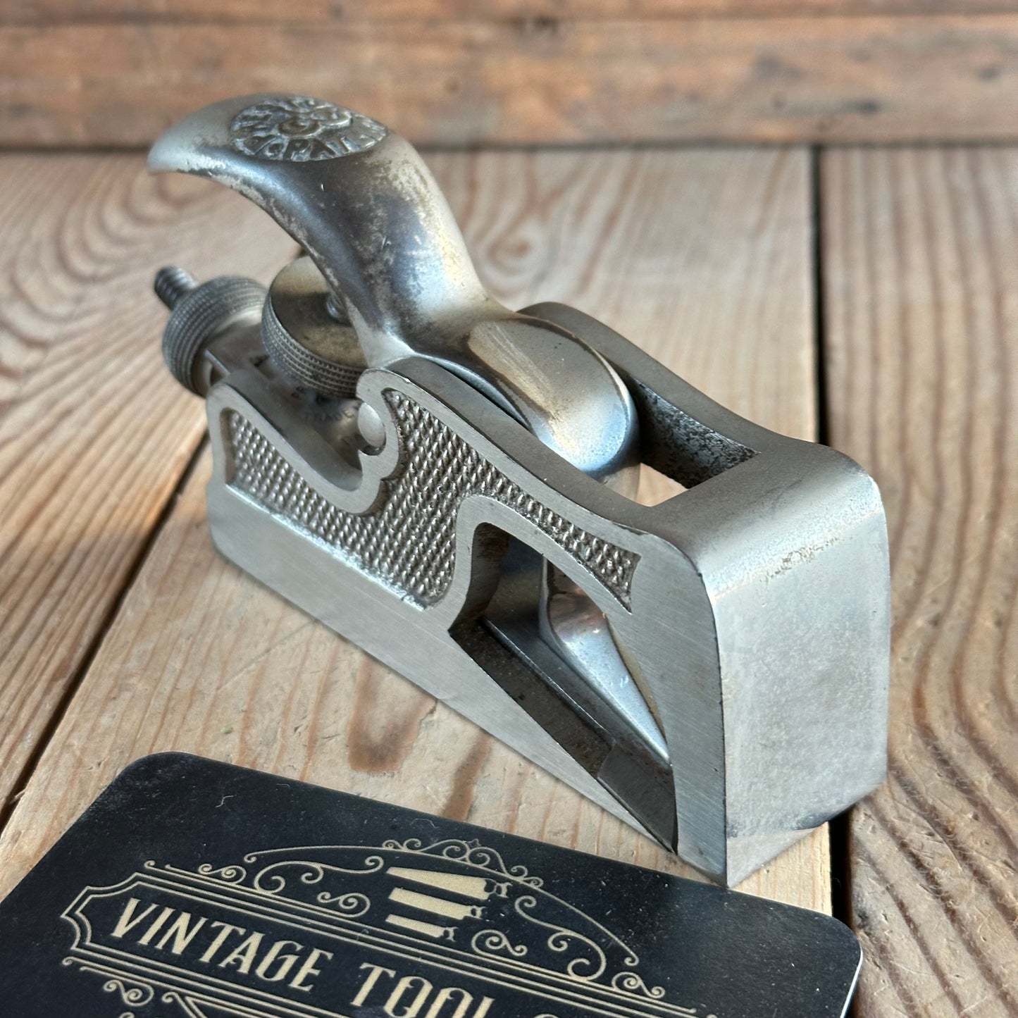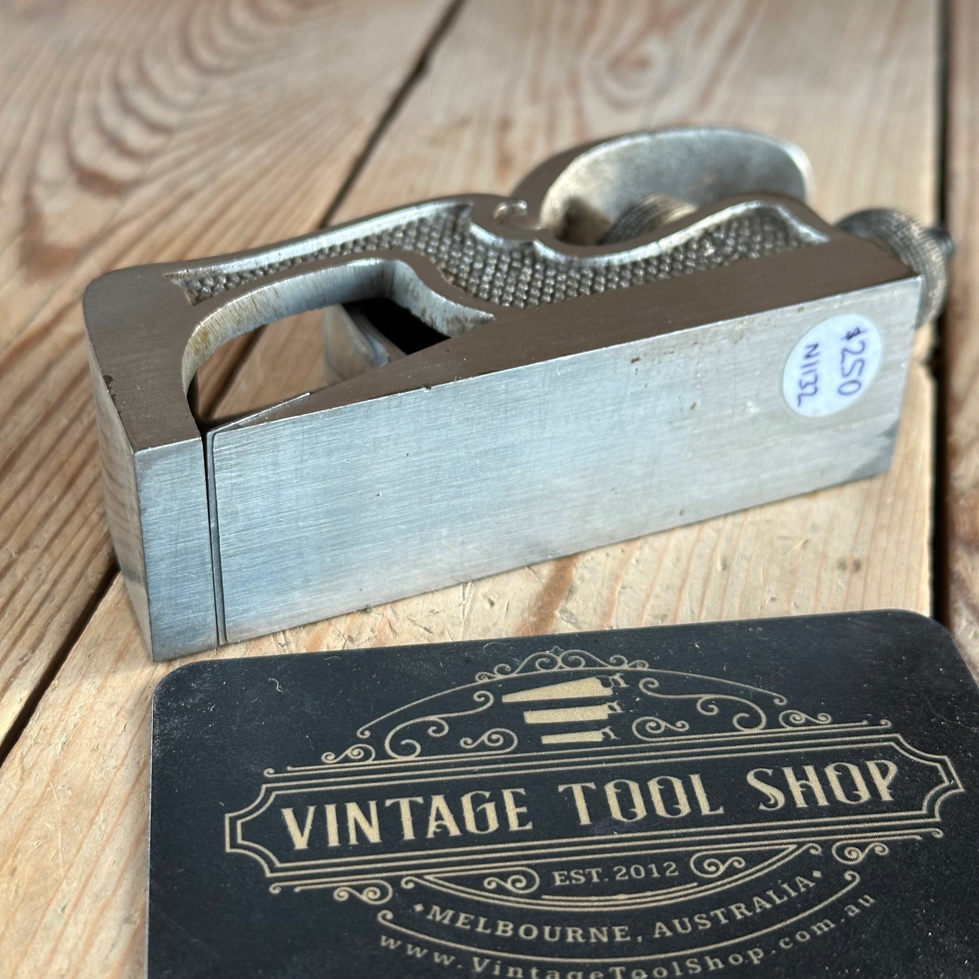This plane is in authentic vintage condition, wear & tear consistent with age & use, some patches of plating loss, matching number stamped body, blade & cap iron, a handy plane for rebate work, it fits the palm well. A nice tight mouth on this one & its near sharp enough to use.
