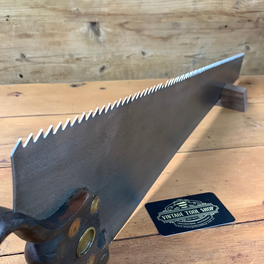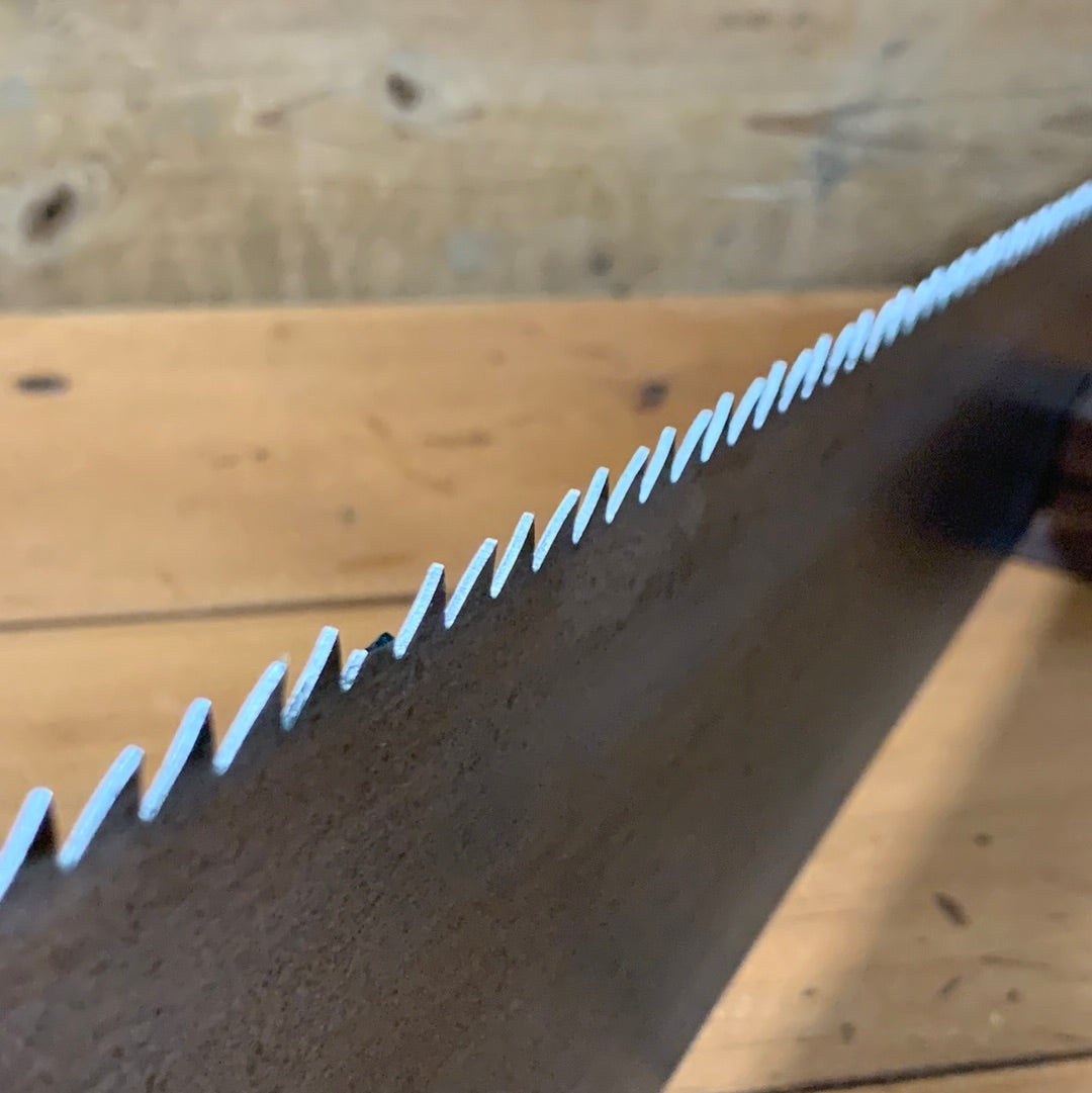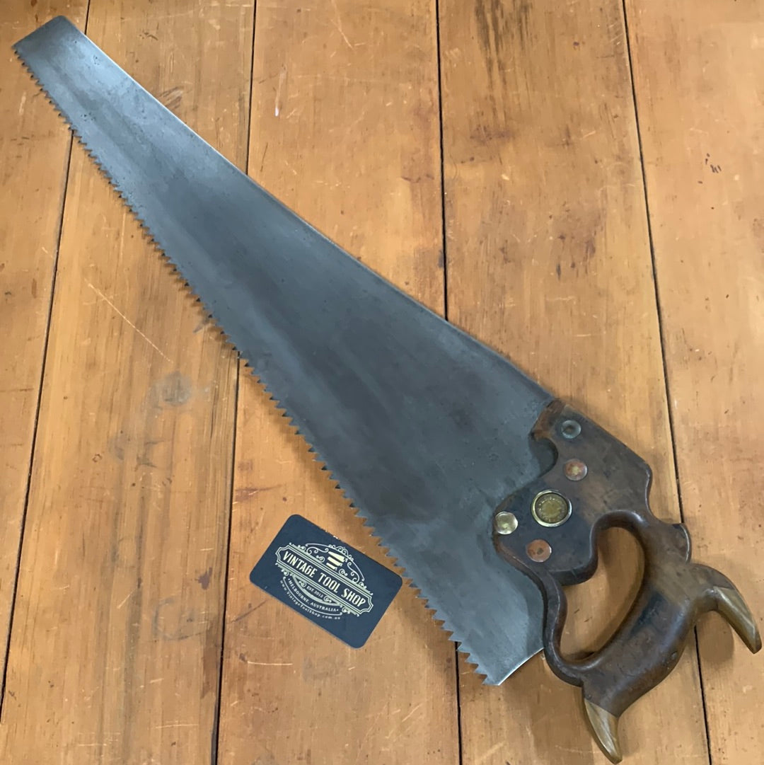 This saw is in authentic vintage condition, wear & tear consistent with age & use, the handle has well executed repairs to the top & bottom horn, a broken tooth about 200mm from the heel that will re grow when sharpened, freshly hand sharpened & set, scattered pitting to the plate.