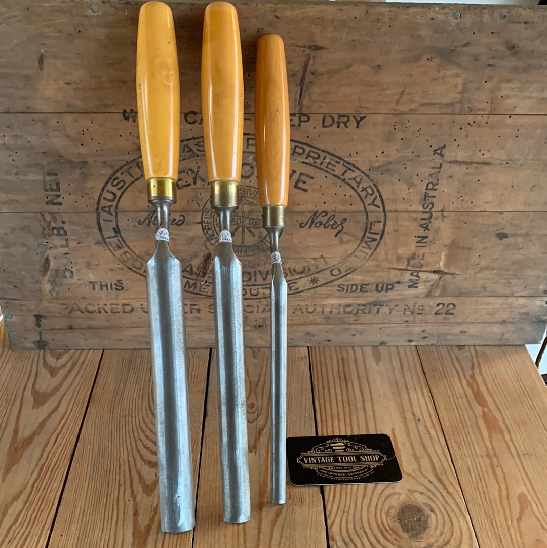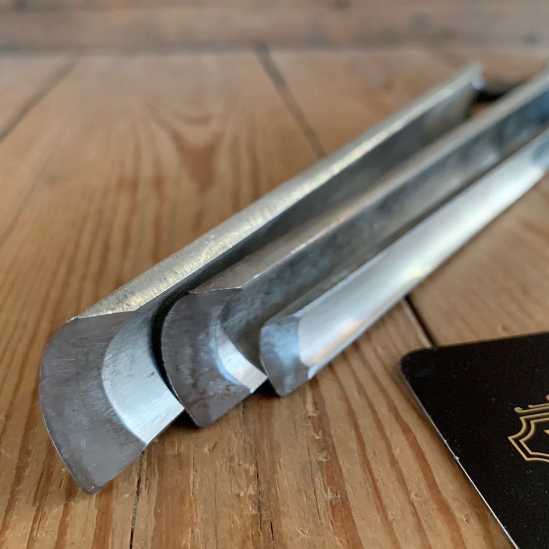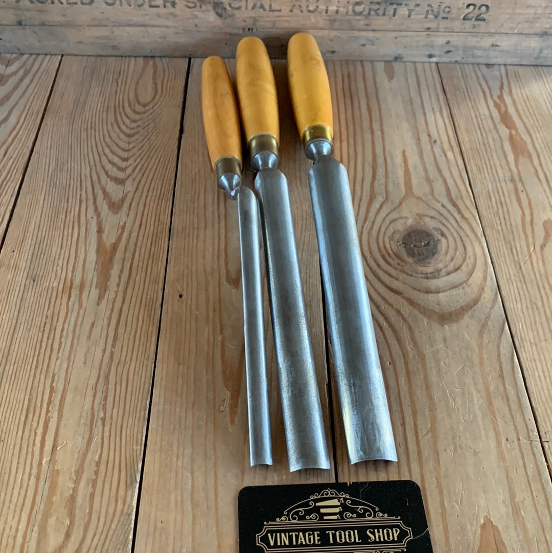 These chisels are in authentic vintage condition, wear & tear consistent with age & use, they will require light sharpening prior to use, a great set of 3 x paring gouges in very handy sizes.