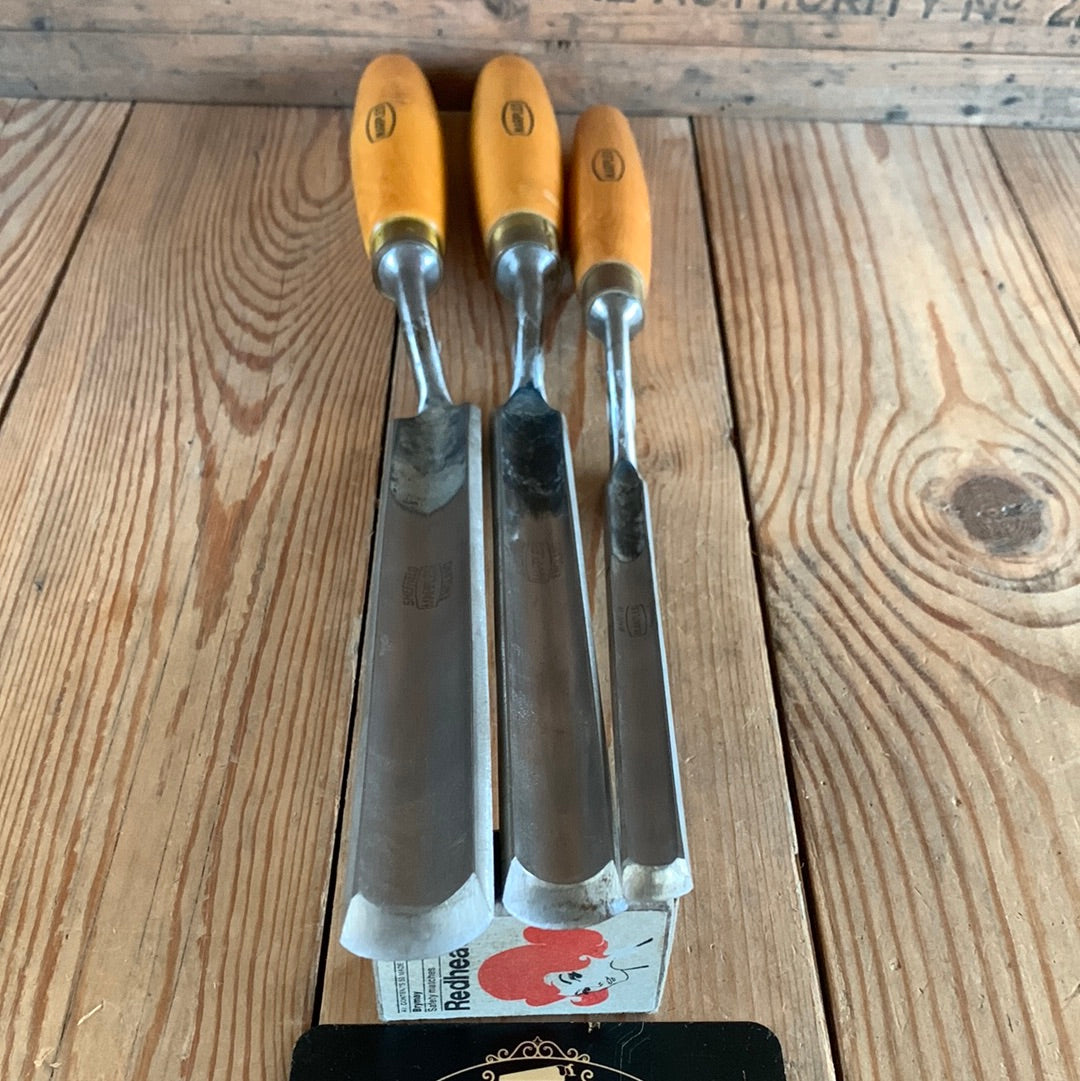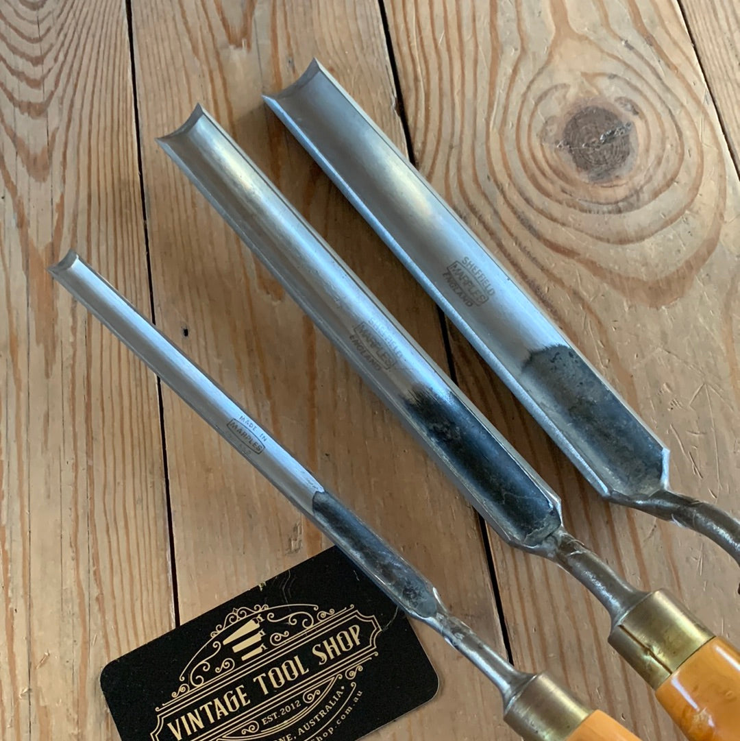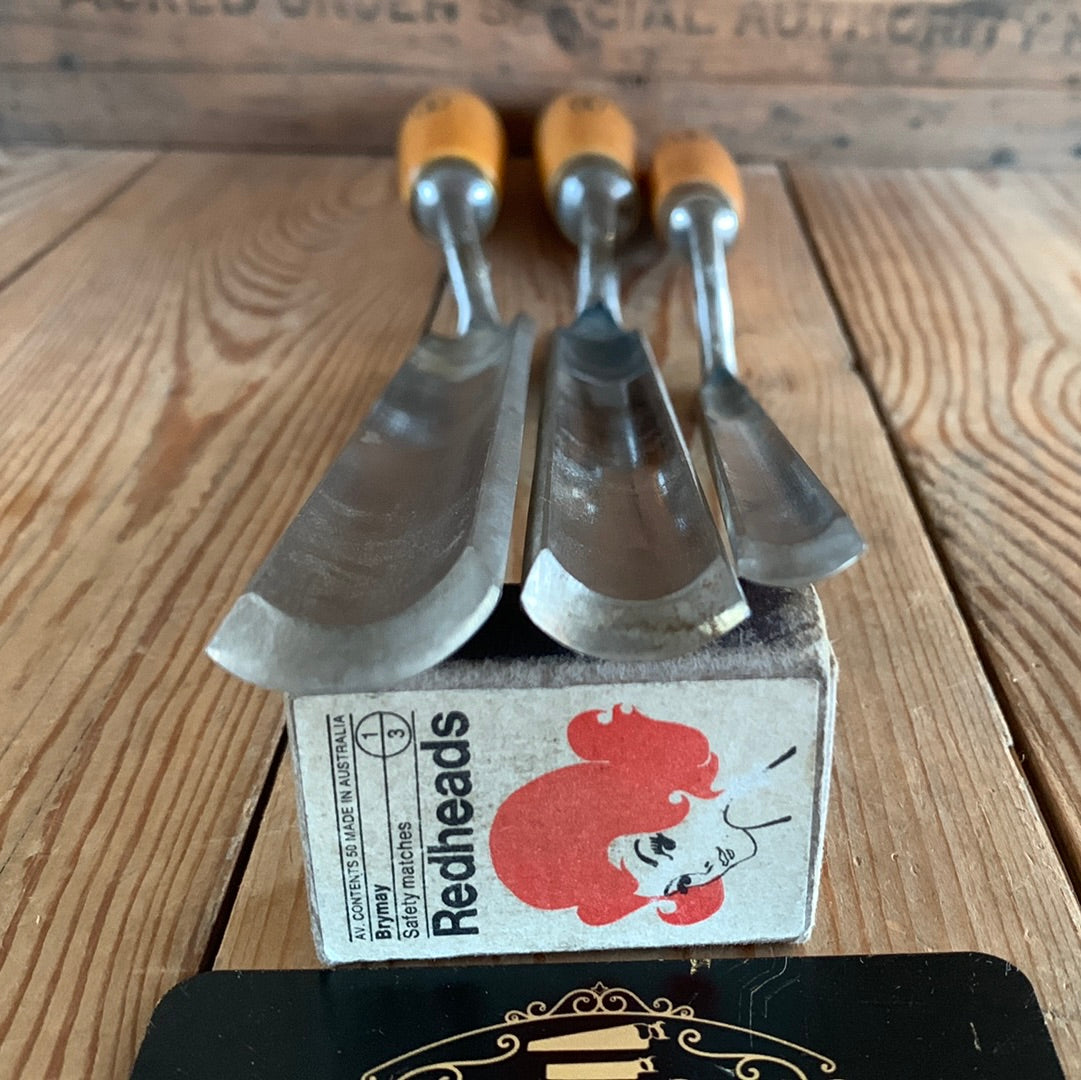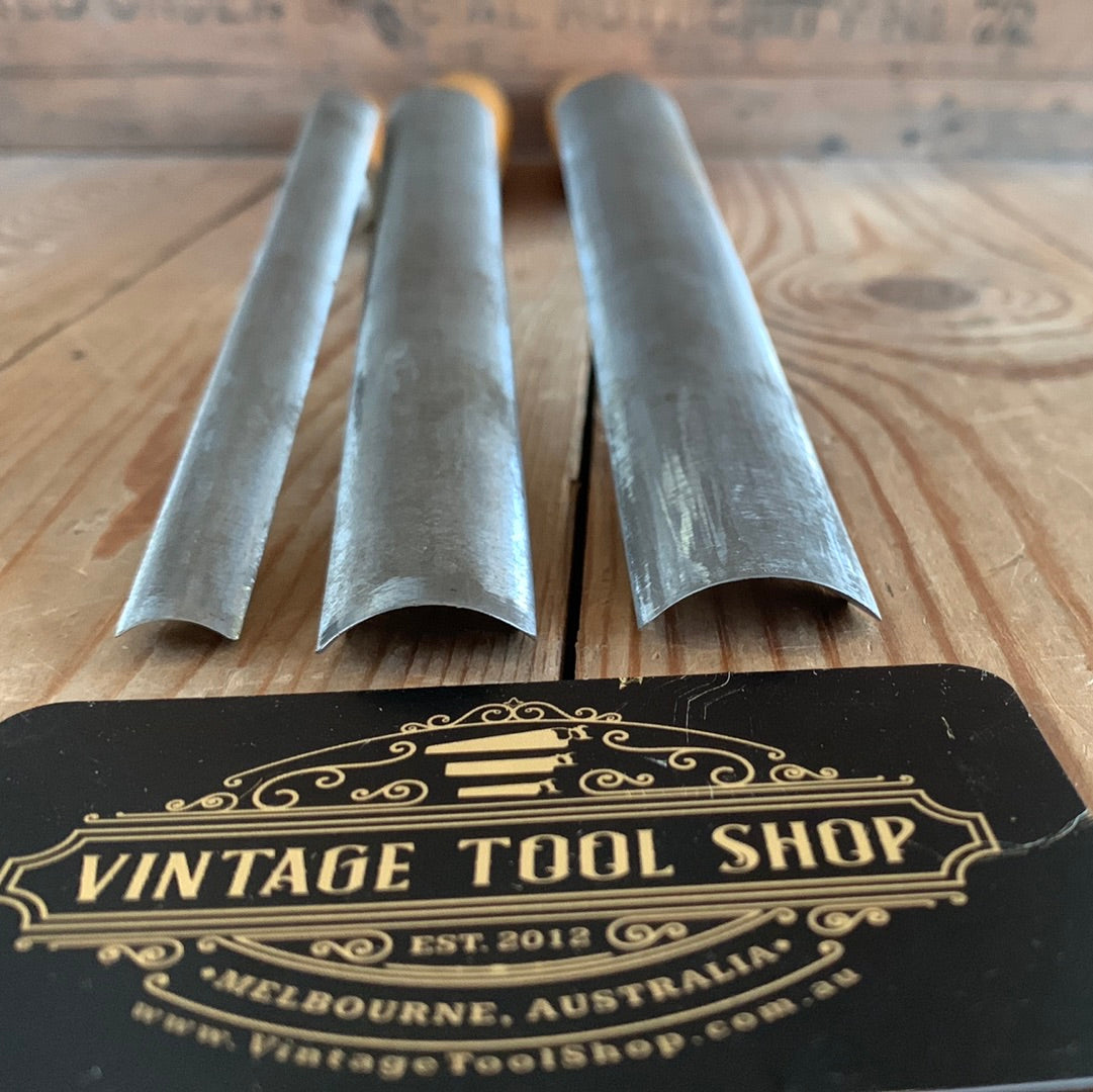 These chisels are in authentic vintage condition, wear & tear consistent with age & use, they will require light sharpening prior to use, a great set of 3 x paring gouges in very handy sizes.