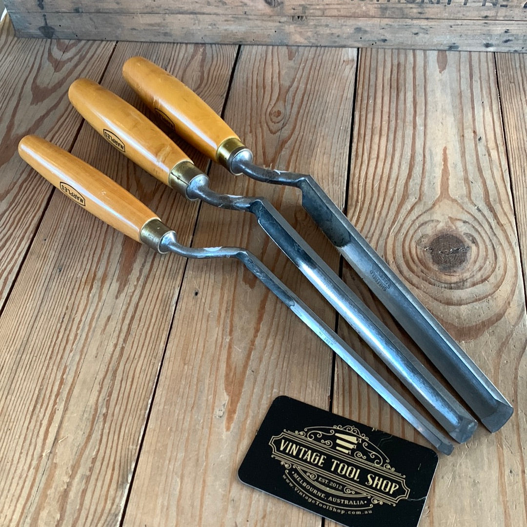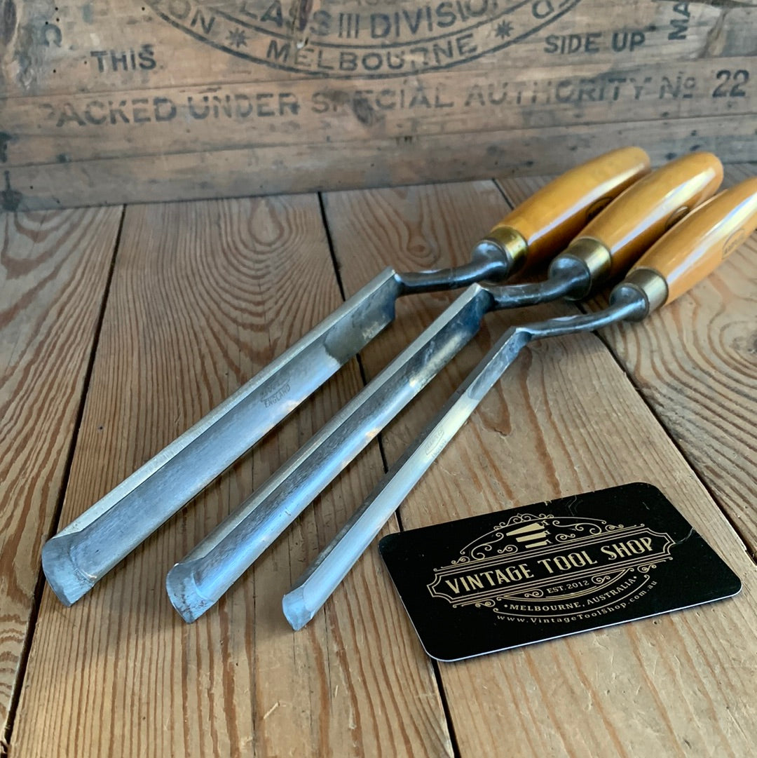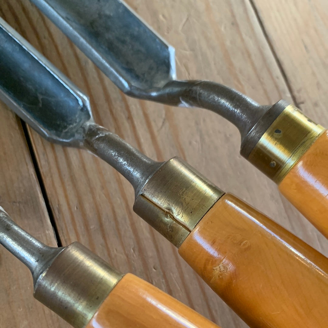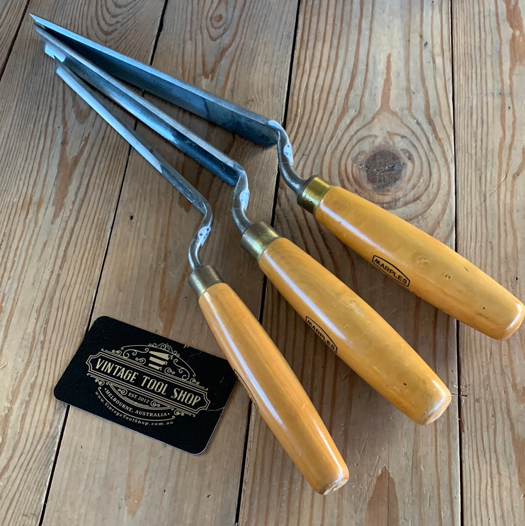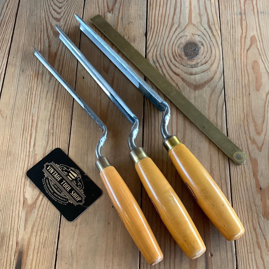 A handy vintage set of 3 x CRANKED incannel PARING GOUGES by iconic Sheffield toolmaker MARPLES with gorgeous boxwood handles.